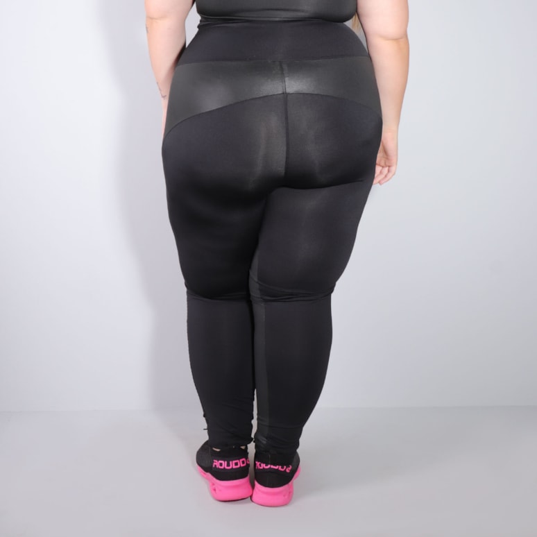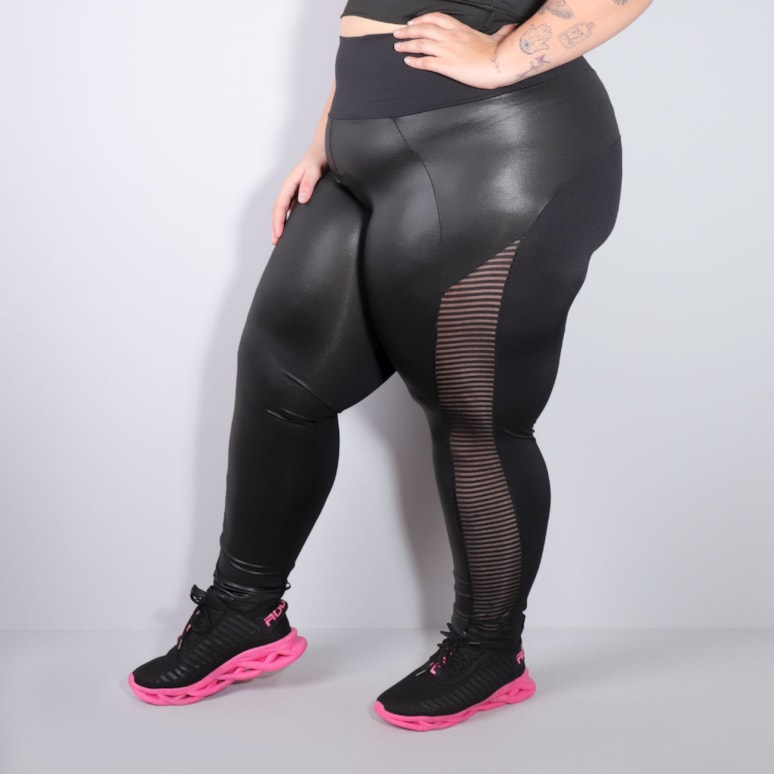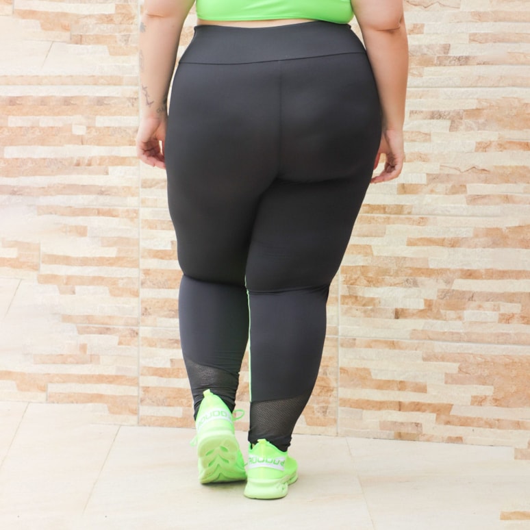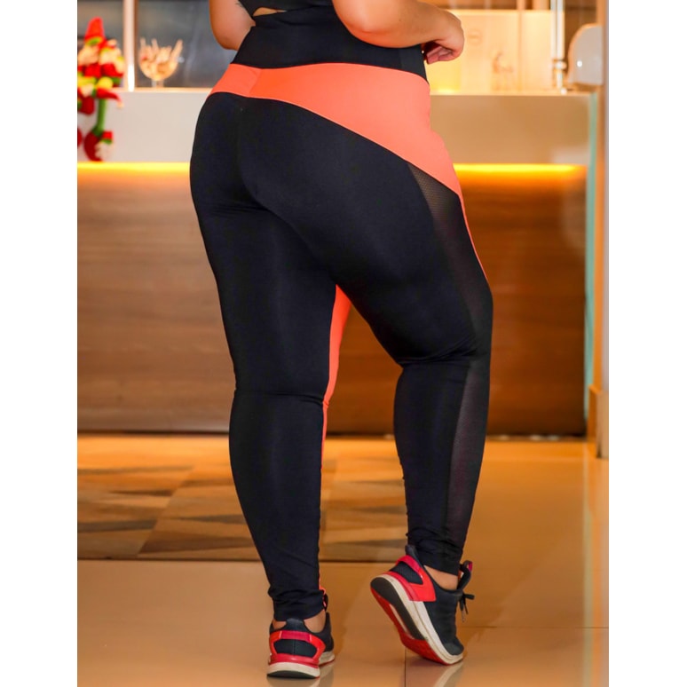 Calça fitness plus size preta cintura alta com recortes de tela de poliamida laranja fabricada em suplex de poliéster preto