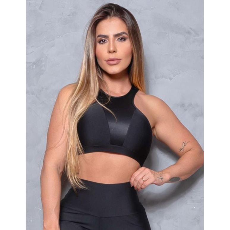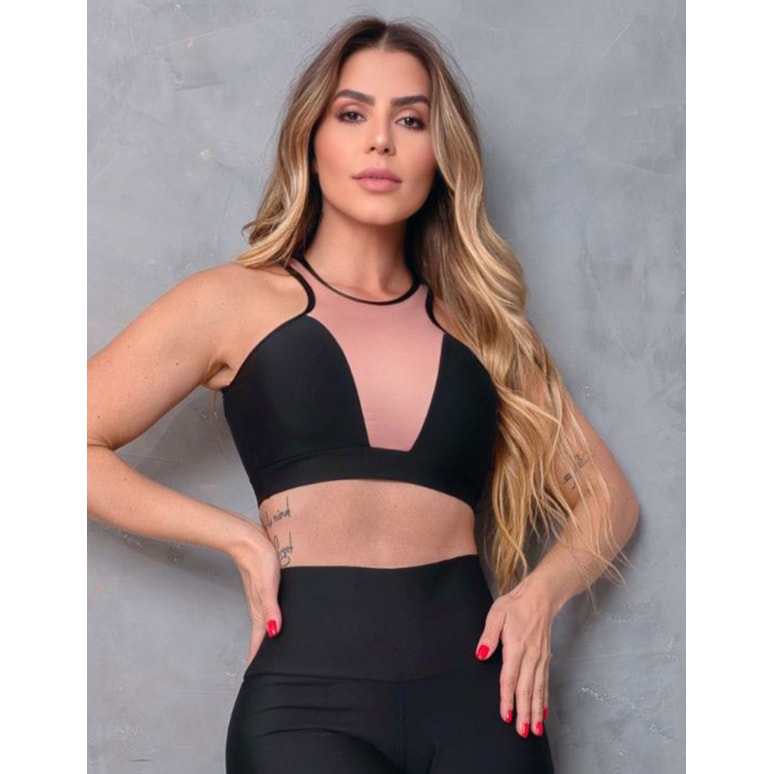 Top Fitness Feminino sem Bojo e com Recortes em Tela e Cirrê