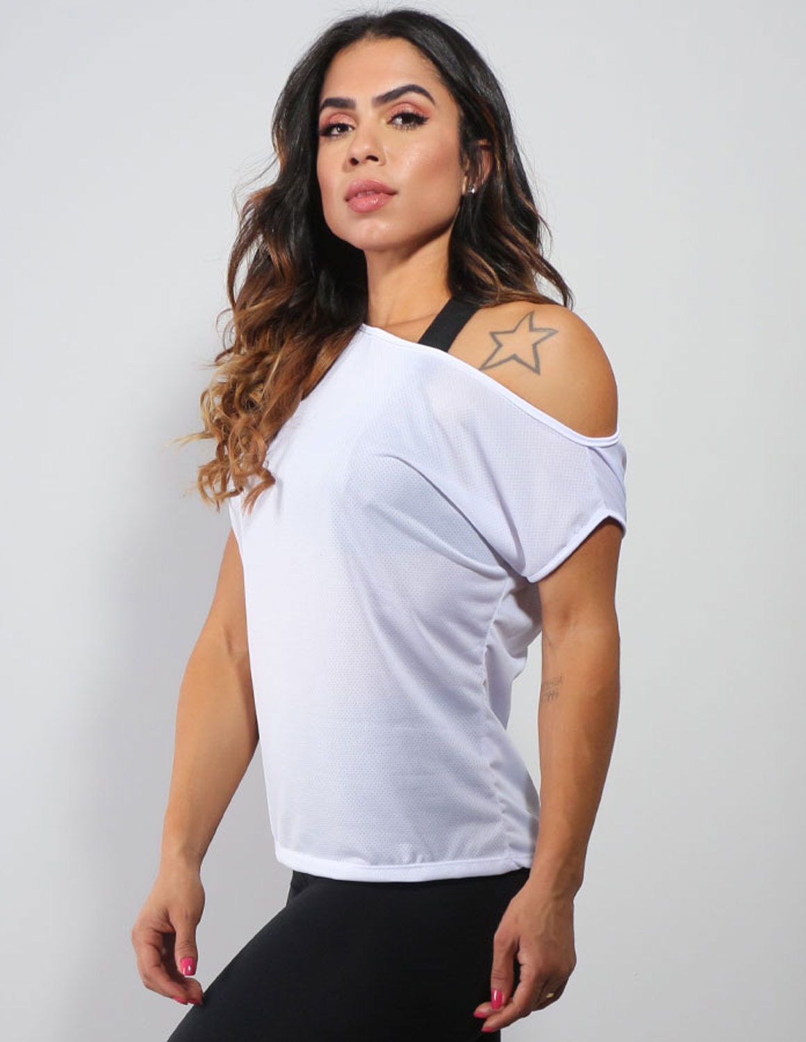bata confeccionada em dry fit de poliéster branco, tecido que possui tecnologia que transporta o suor para as camadas mais externas do tecido. proporciona rápida absorção e evaporação da umidade. perfeito para prática esportiva.