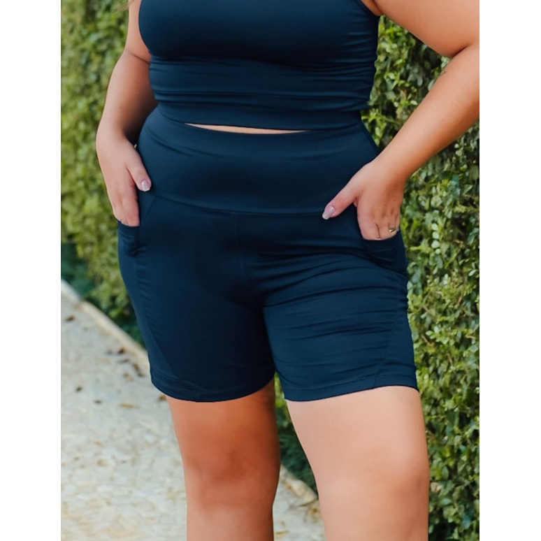 Bermuda feminina fitness meia coxa na cor azul marinho confeccionada em suplex de poliéster com recortes em tela e bolsos nas laterais.