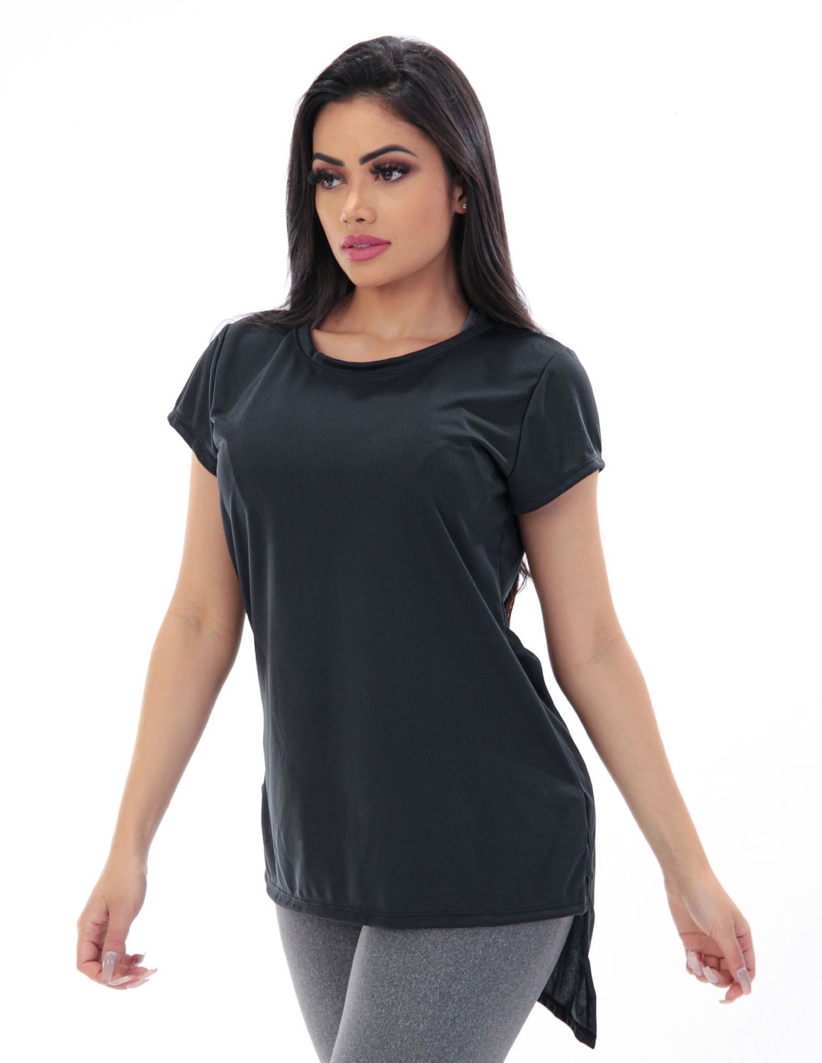 blusa feminina fabricada em dry fit de poliéster preto com manguinhas e recorte nas laterais.
