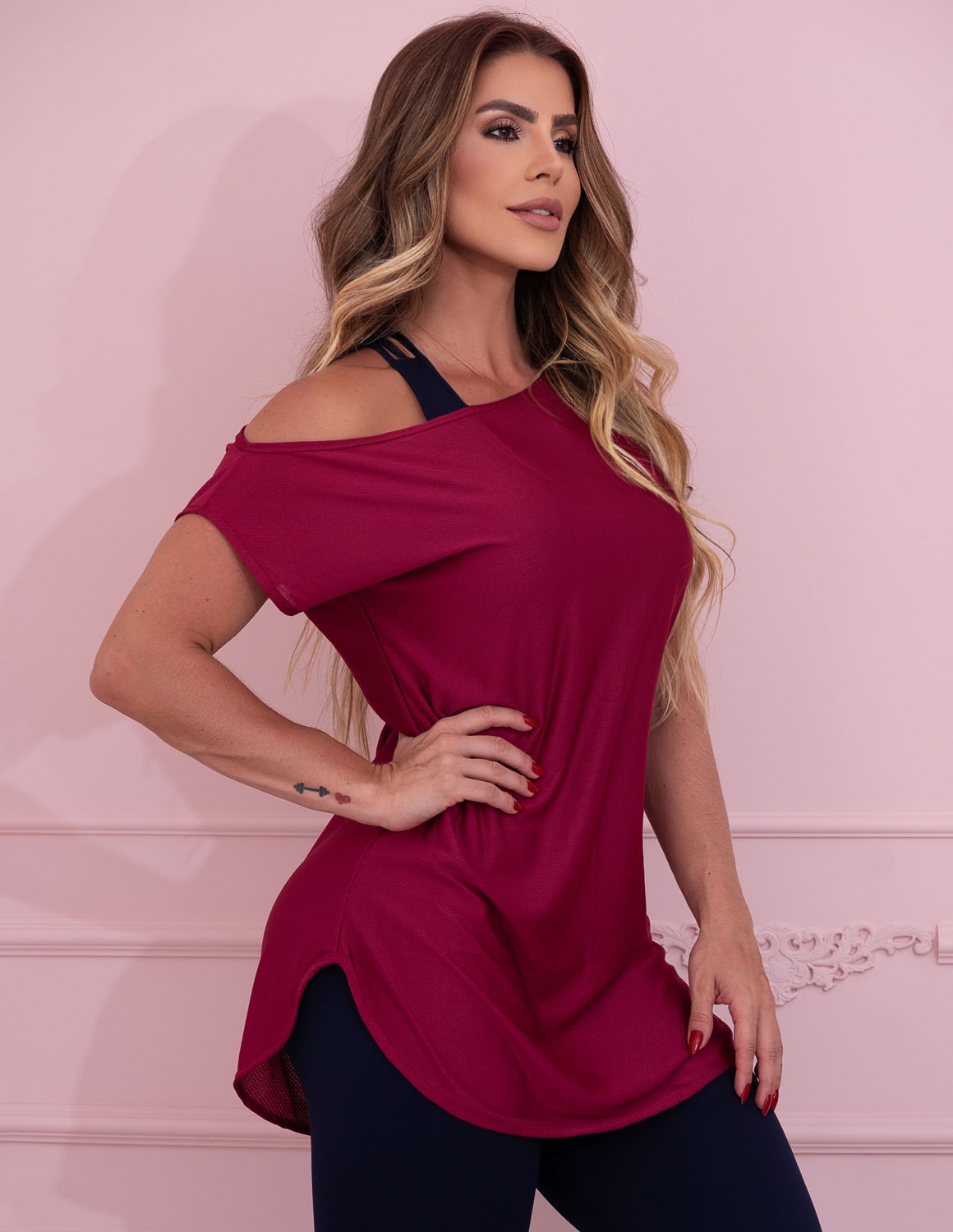 a blusa tem um caimento perfeito no corpo, pois apresenta uma das mangas mais longa que a outra, além de ser super fresquinha e seca super rápido.