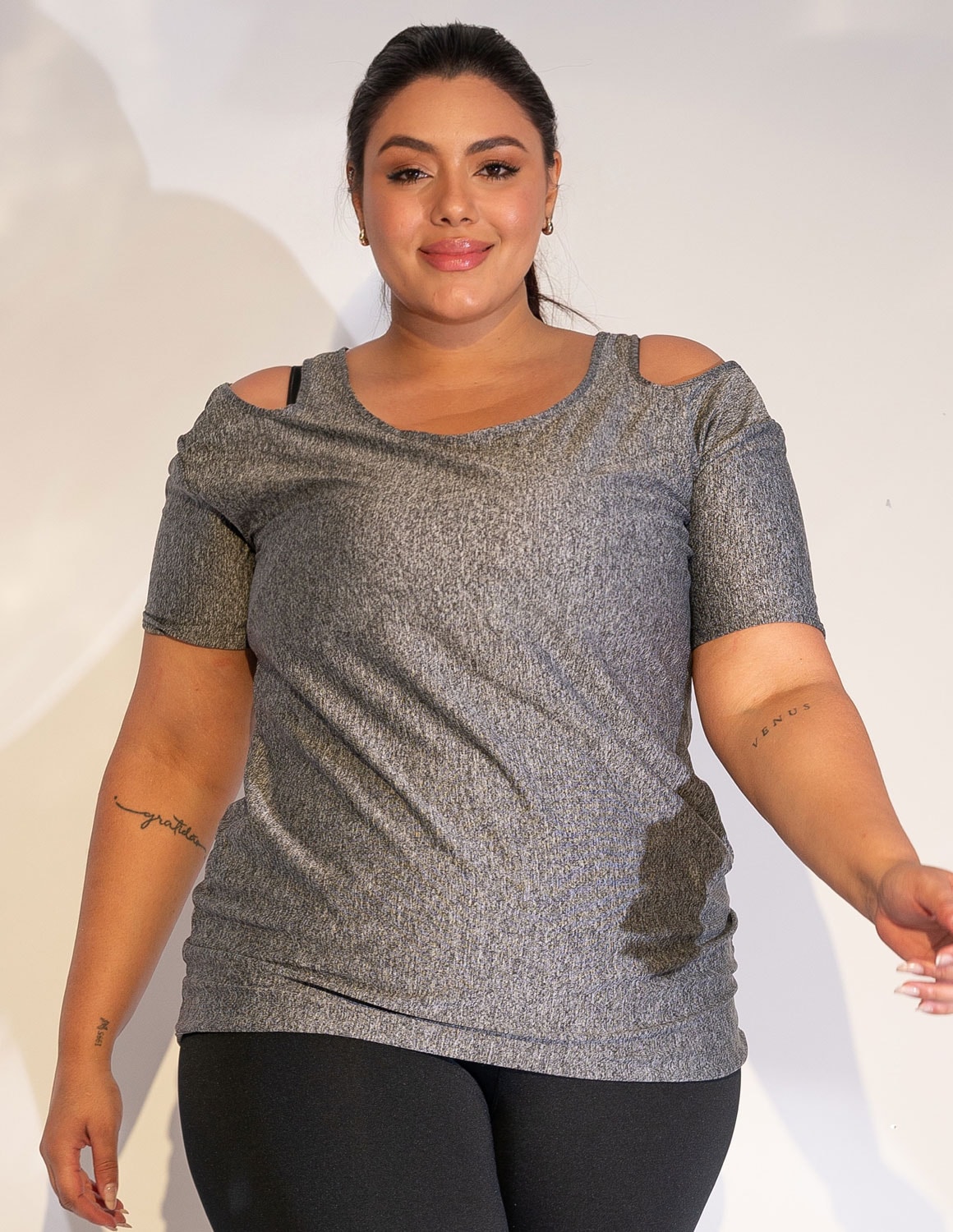 blusa fitness feminina plus size confeccionada em dry fit de poliéster na cor mescla. com um design moderno e arrojado, a blusa torna-se um modelo único que não pode faltar no seu guarda roupas. a tecnologia do tecido dry fit permite que o suor produzido pelo corpo seja absorvido com maior facilidade, isso deixa a blusa ainda mais leve e você com mais conforto. a modelagem ainda inclui cortes nos ombros em forma de gota, acabamentos que dão um toque a mais de charme e beleza ao modelo.