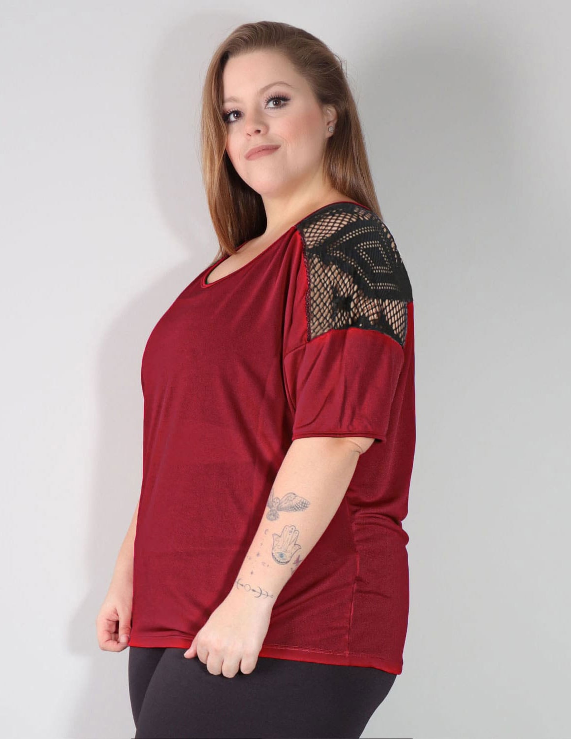 blusa feminina plus size fabricada em dry fit de poliéster vinho com recortes de tela preta na altura dos ombros