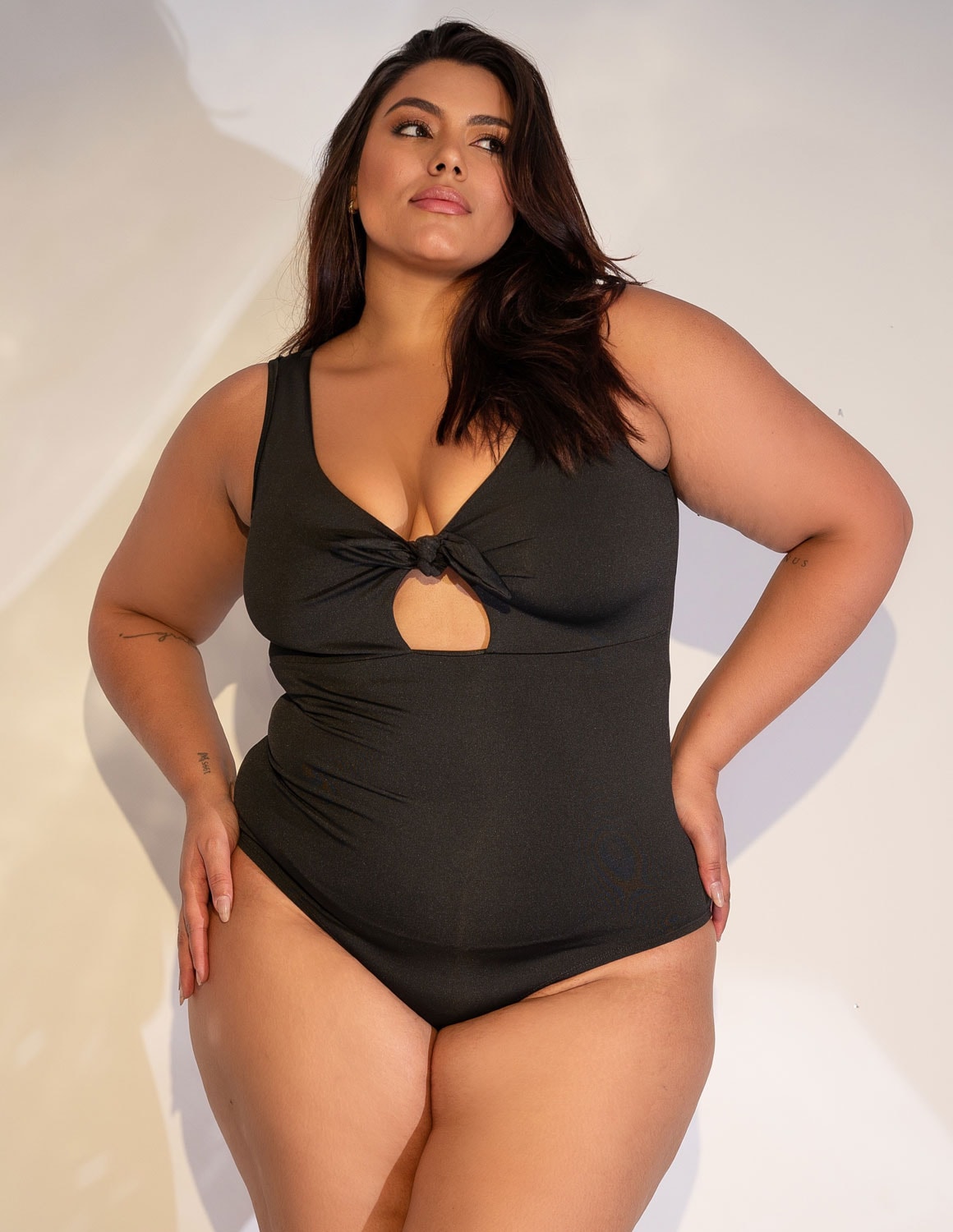 body plus size preto sem bojo fabricado em suplex de poliéster com decote de tiras que podem ser amarradas