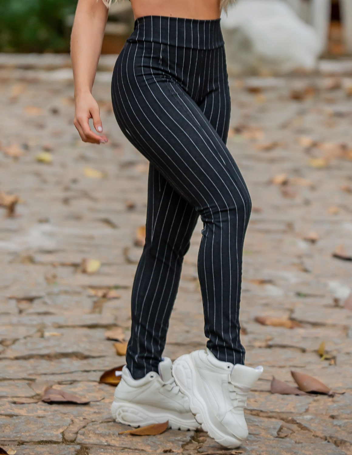 as listas brancas do tecido no estilo risco de giz deixam a calça com uma pegada bastante sofisticada e charmosa.