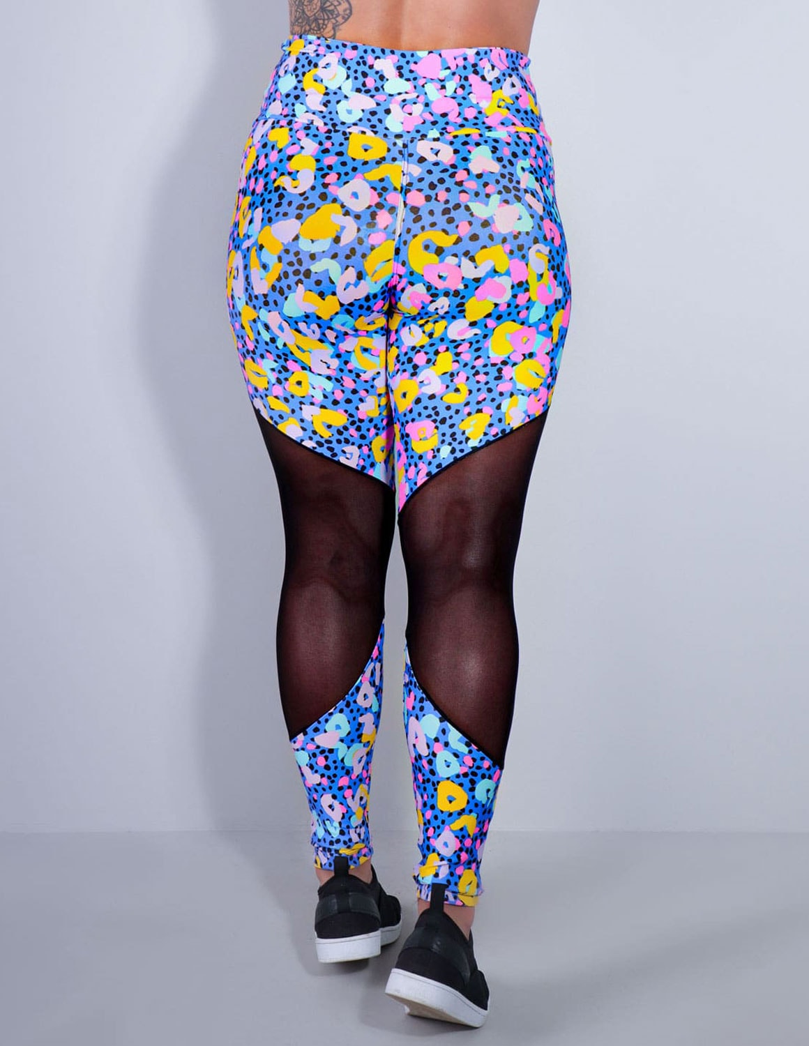 calça feminina fitness confeccionada em suplex de poliéster estampado com recortes de tule preto nas pernas