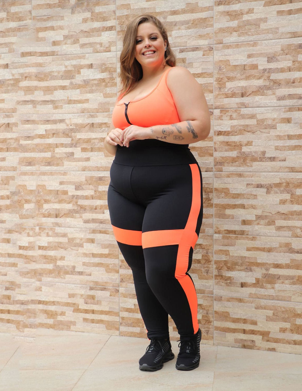 calça legging feminina plus size cós alto fabricada em suplex de poliéster preto com recortes laranja neon