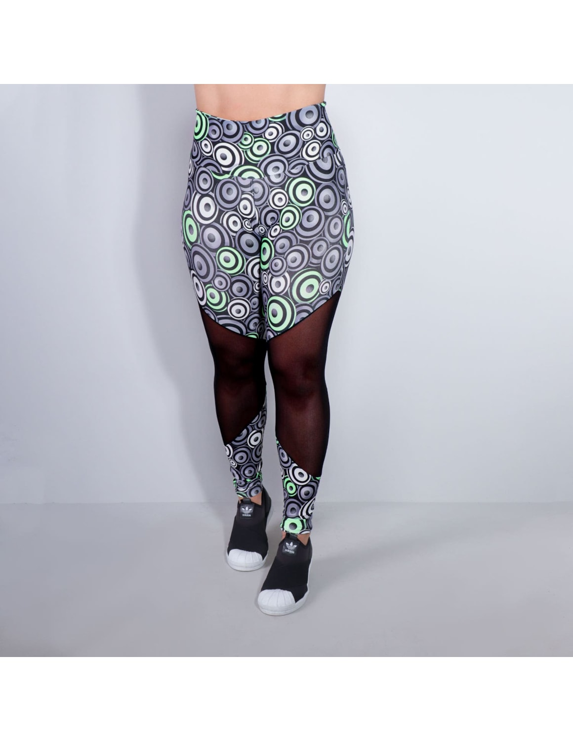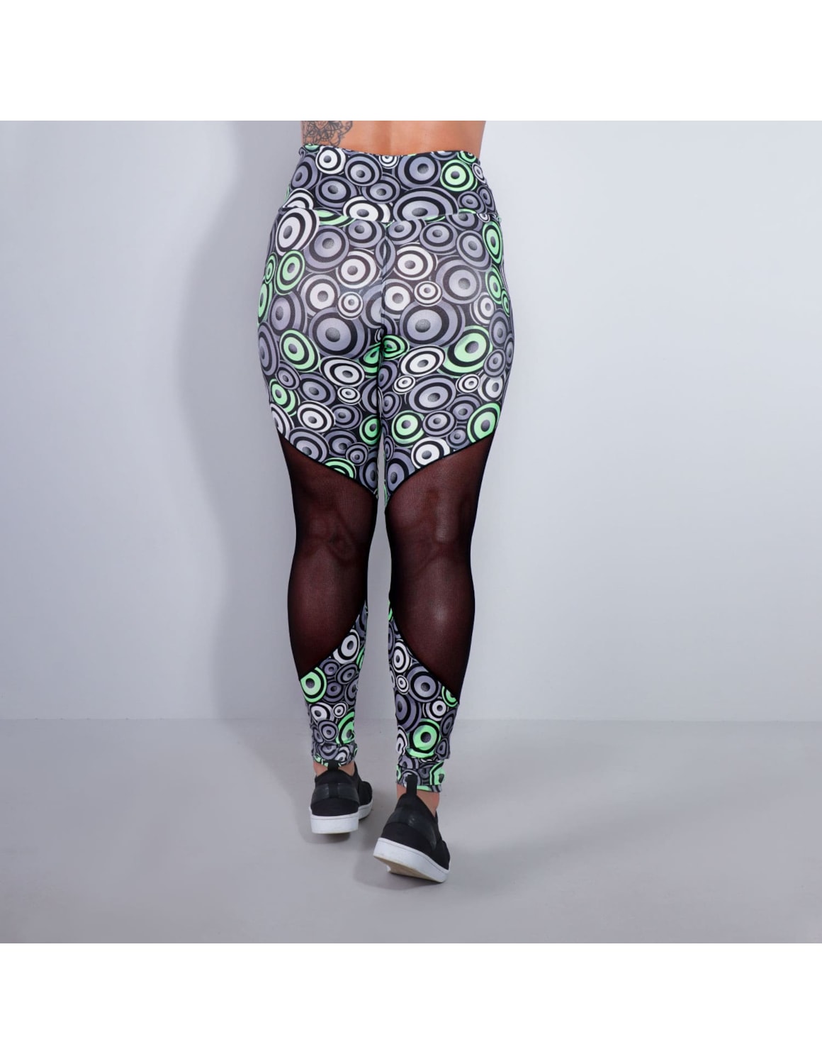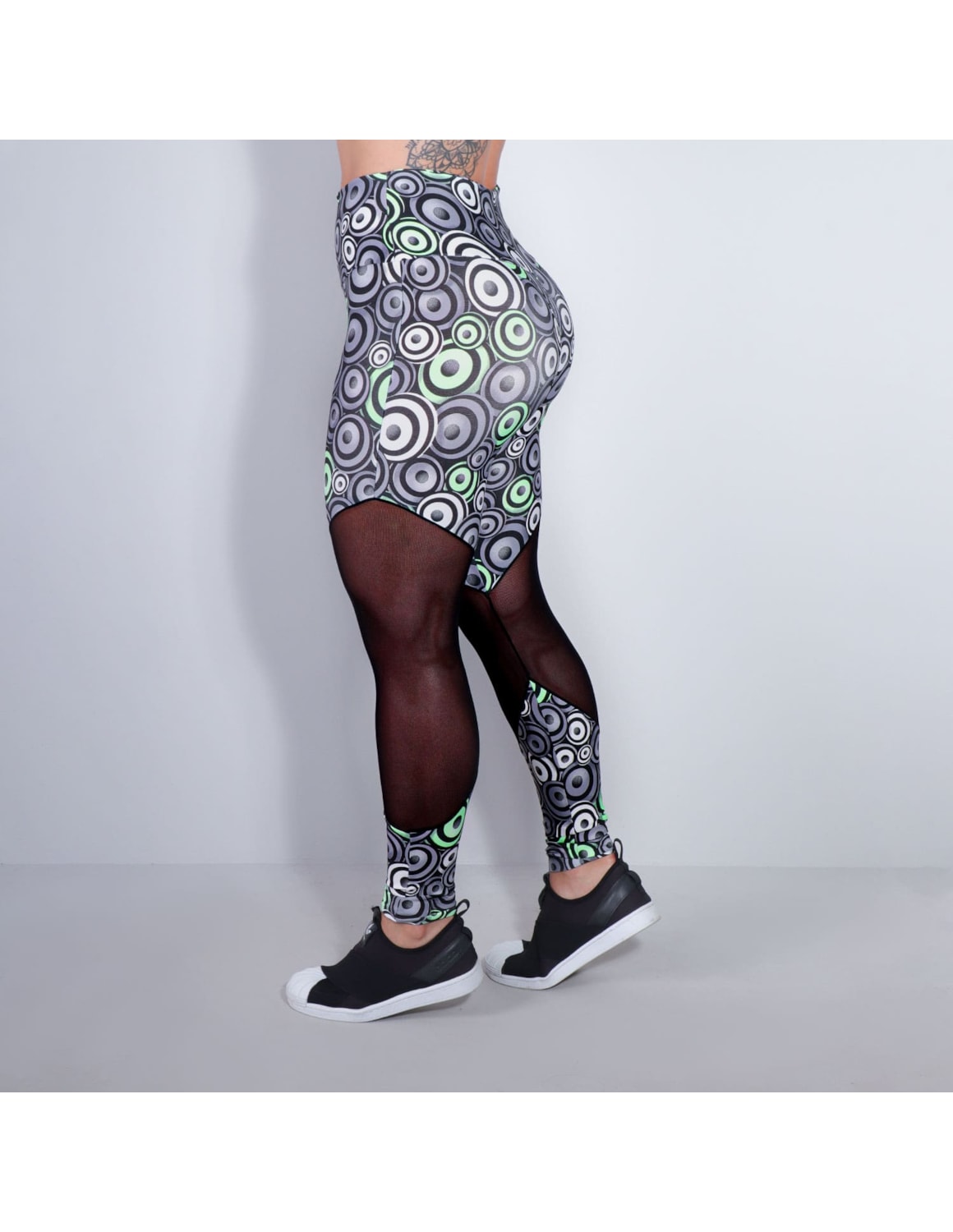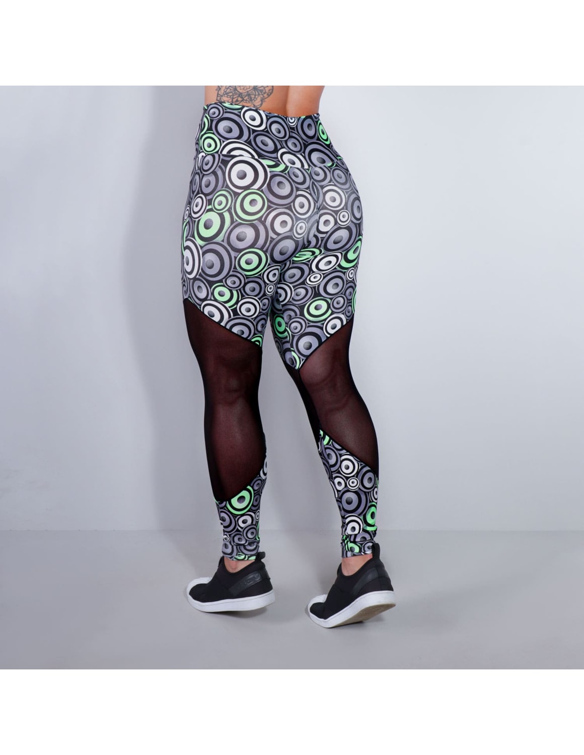 calça feminina fitness estampada em suplex de poliéster com recortes de tule preto nas pernas