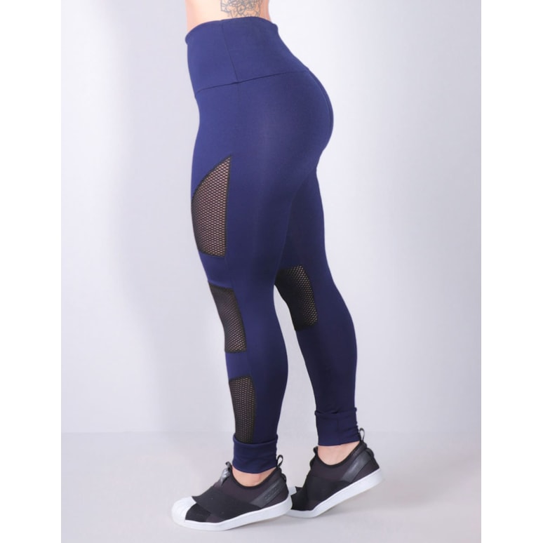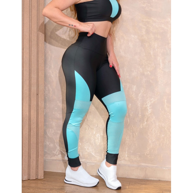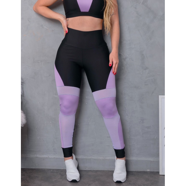 Calça punho feminina confeccionada em suplex com recortes de tela e cirrê.