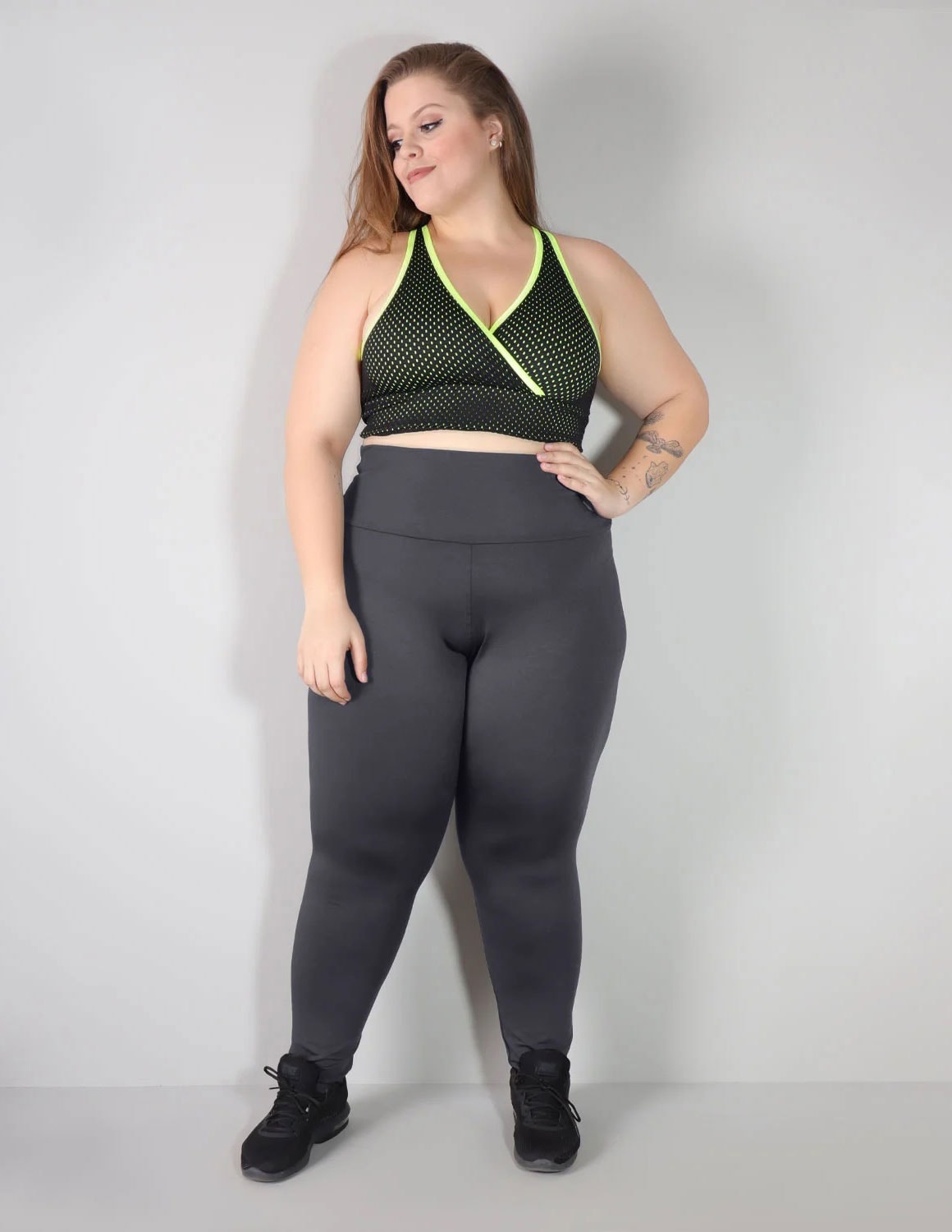calça fitness plus size confeccionada em suplex de poliéster grafite com cós alto