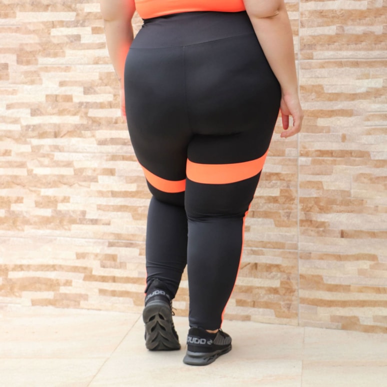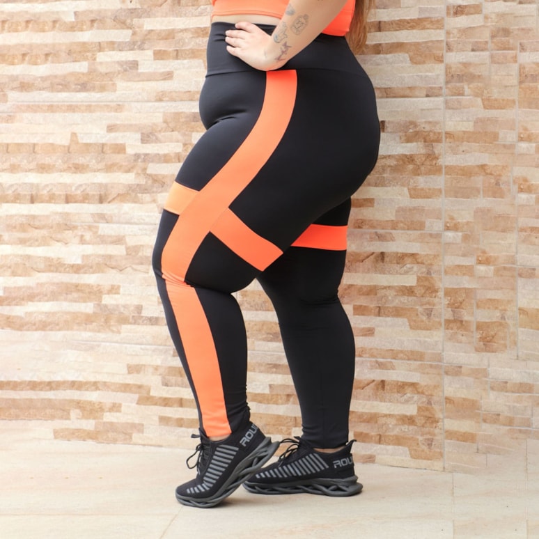 Calça legging feminina plus size preta fabricada em suplex de poliéster com recortes laterais na cor laranja