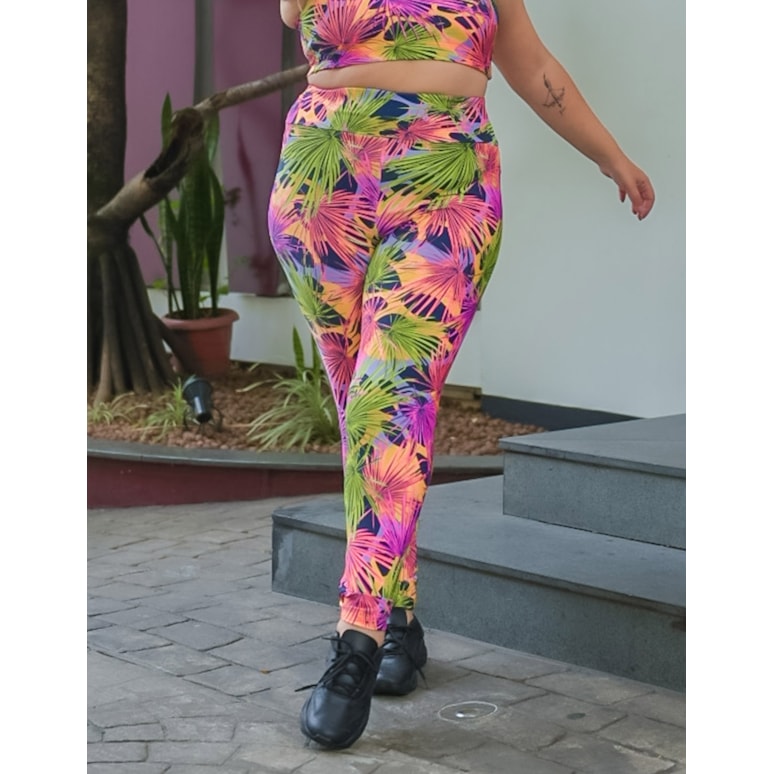 O cós alto tem cerca de 11 cm e dupla camada de tecido com elástico embutido, isso ajuda na sustentação da calça no seu corpo e modela as curvas da região da cintura.