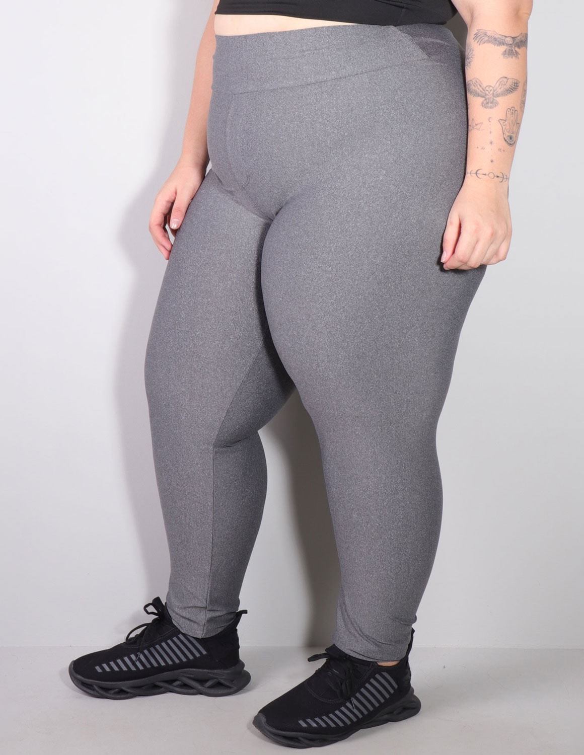 calça legging plus size mescla com bolsos traseiros fabricada em suplex de poliéster