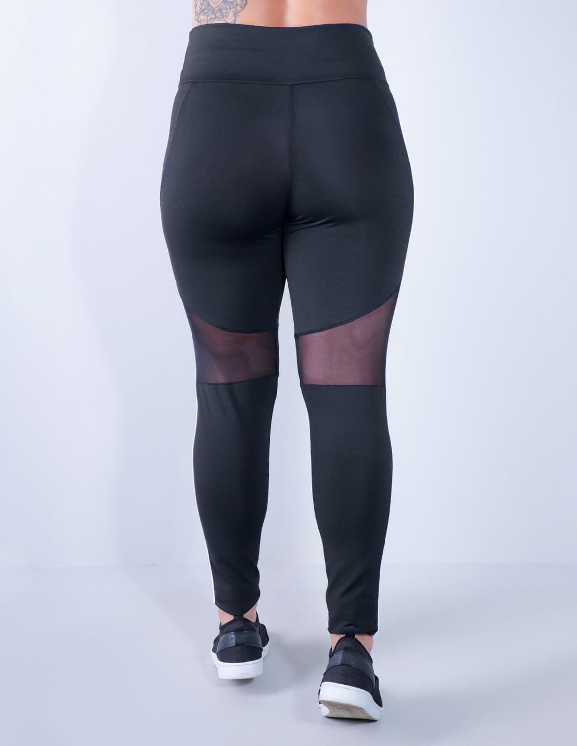 calça legging preta feminina fitness confeccionada em suplex de poliéster com listras brancas e recortes de tule preto nas pernas