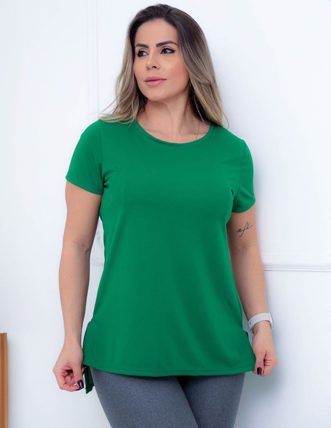 camisa feminina mullet academia fitness fabricada em dry fit com manguinhas, recortes nas laterias e alongada atrás.
