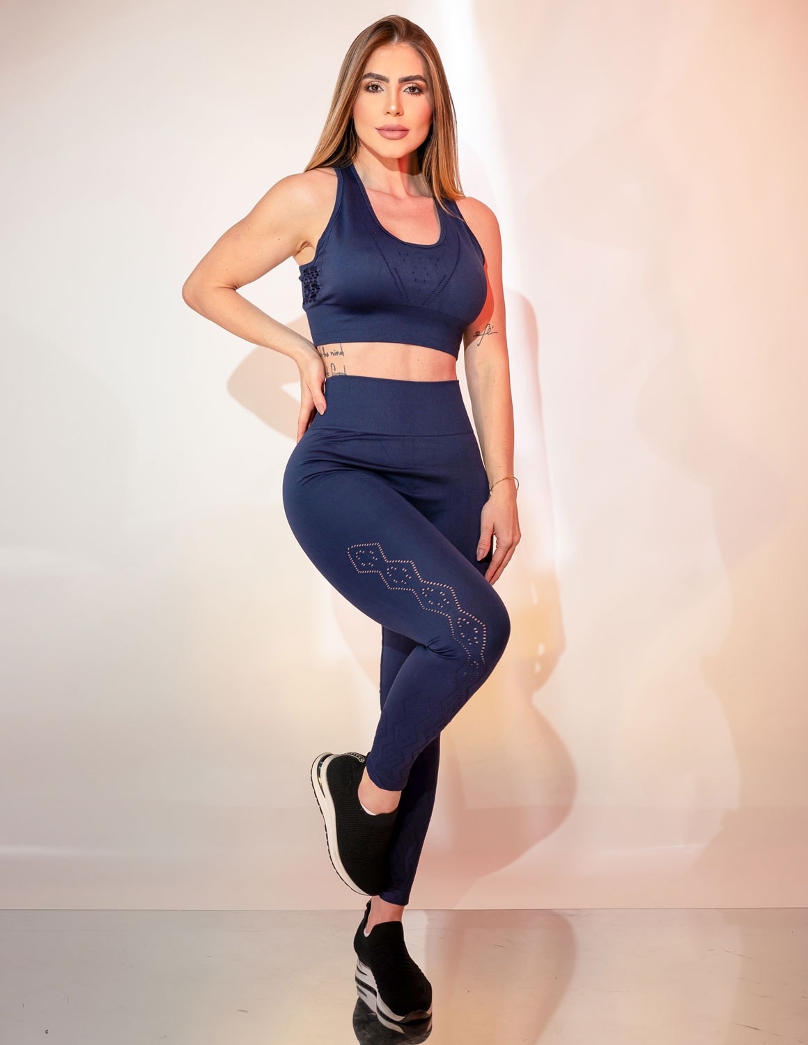conjunto esportivo calça e cropped em poliamida zero costura com design moderno a laser.