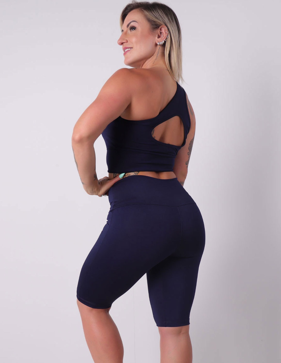 conjunto feminino azul marinho com bermuda ciclista (4.4.1574) e cropped com bojo removível (4.4.1821) de poliéster de alta qualidade.