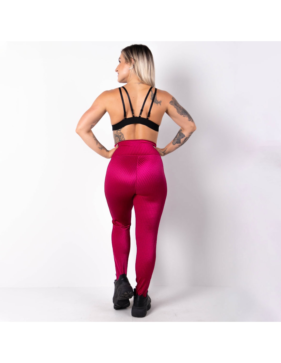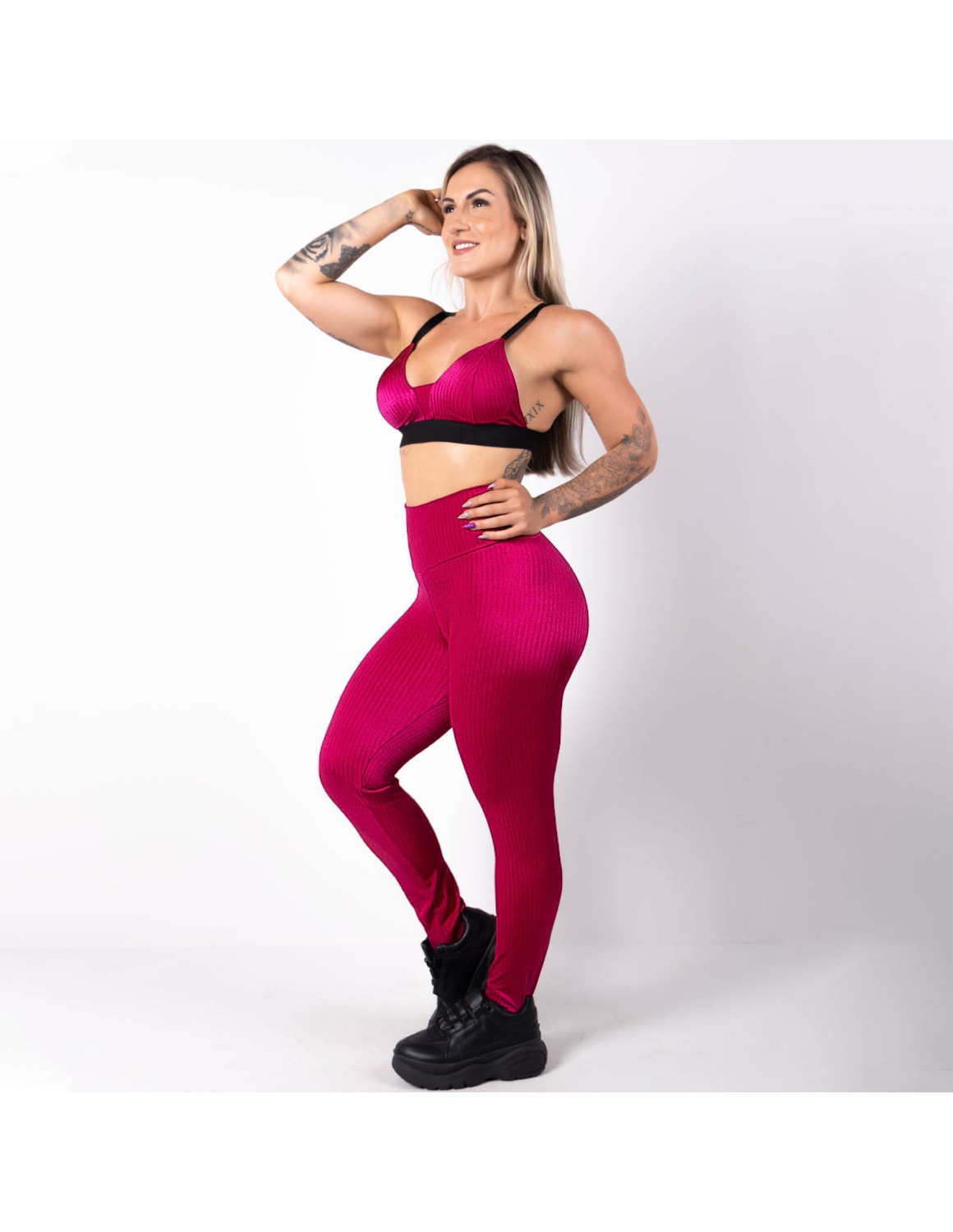 conjunto em poliamida texturizado na cor uva com calça legging cintura alta (3.3.2542) e top com bojo removível (3.3.2567).