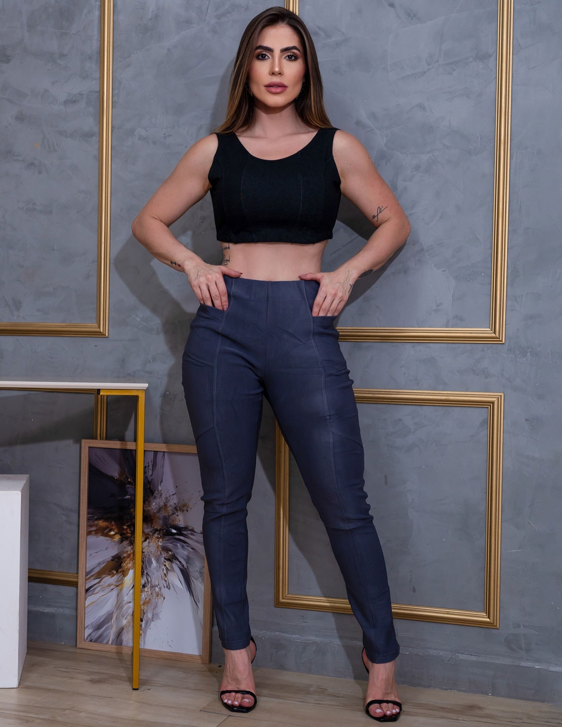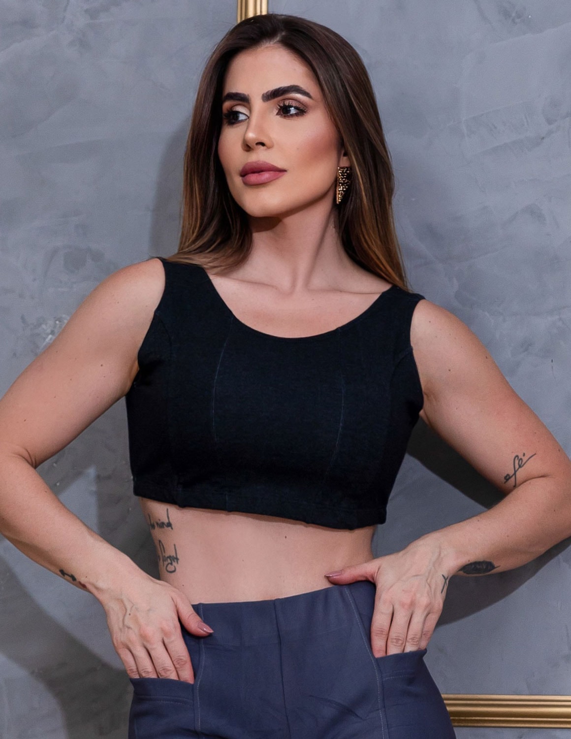 cropped feminino fabricado em viscose fake jeans. modelagem que proporciona muito conforto e elasticidade na medida certa. indicado para compor o look ideal para seus treinos ou no dia a dia.