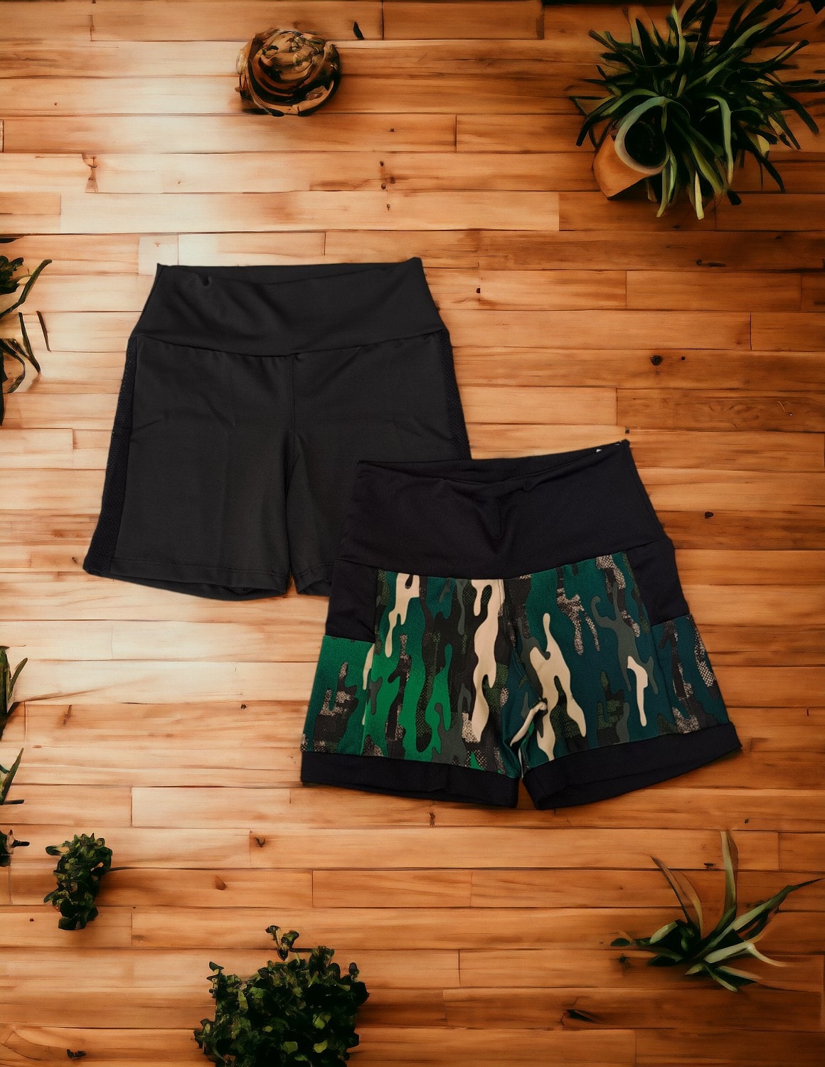 este kit de shorts esportivos é a união perfeita entre estilo e praticidade, oferecendo duas opções distintas para quem aprecia variedade em seu vestuário de treino. um par apresenta um padrão de camuflagem em tons de verde, preto e bege, injetando um elemento de design arrojado, enquanto o outro é um clássico preto sólido, oferecendo versatilidade e elegância simplificada.