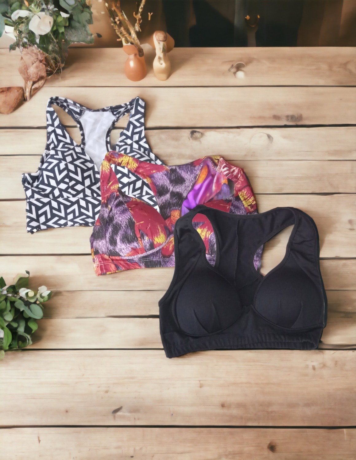 kit com 3 croppeds fitness conforto com bojo e estampas variadas.