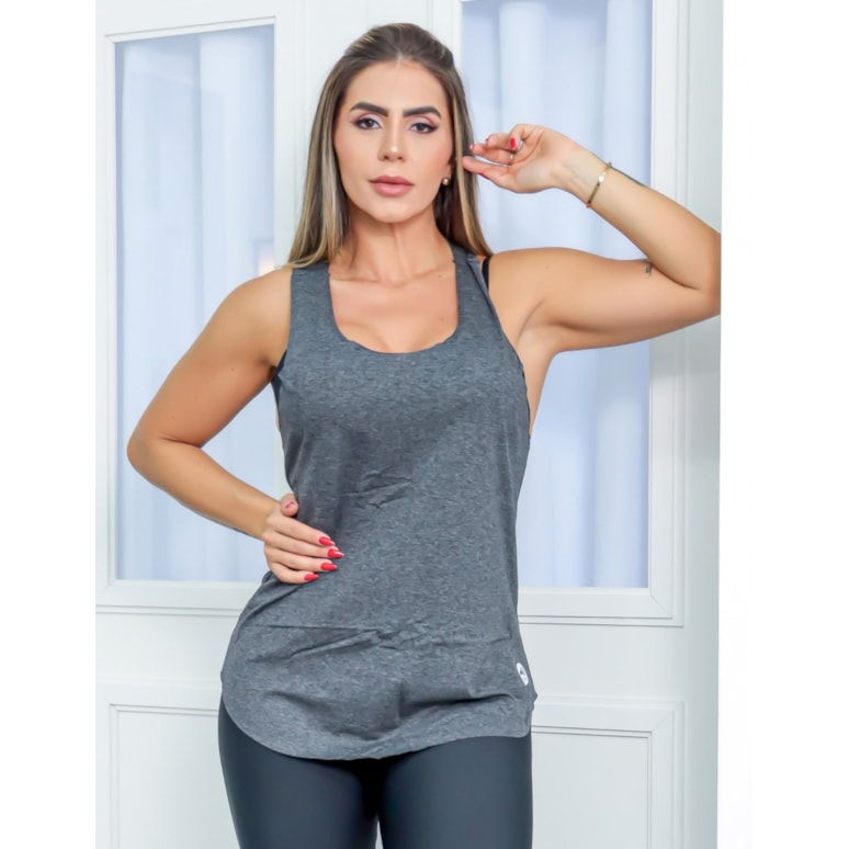 2° modelo: A regata é mais longa na barra, conferindo um estilo moderno e funcional, permitindo maior liberdade de movimento. Possui costas estilo nadador e não possui mangas. O design também inclui uma fenda nas laterais que adiciona um detalhe sutil e elegante. Possui detalhe da marca FITMODA.