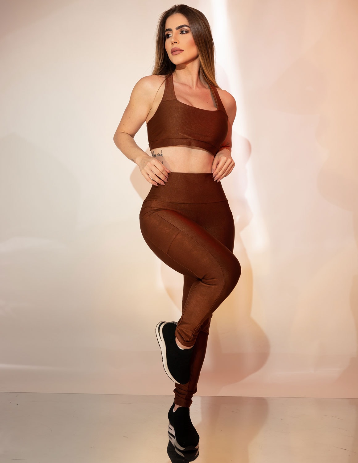 o brilho acetinado dá um toque moderno e sofisticado ao conjunto. o top conta com alças cruzadas nas costas que unem firmeza e estilo. a calça possui modelagem anatômica e bolsos laterais funcionais para trazer praticidade. o destaque vai para o design sem costura frontal, que proporciona acabamento mais limpo e elegante, além de um visual mais alinhado.