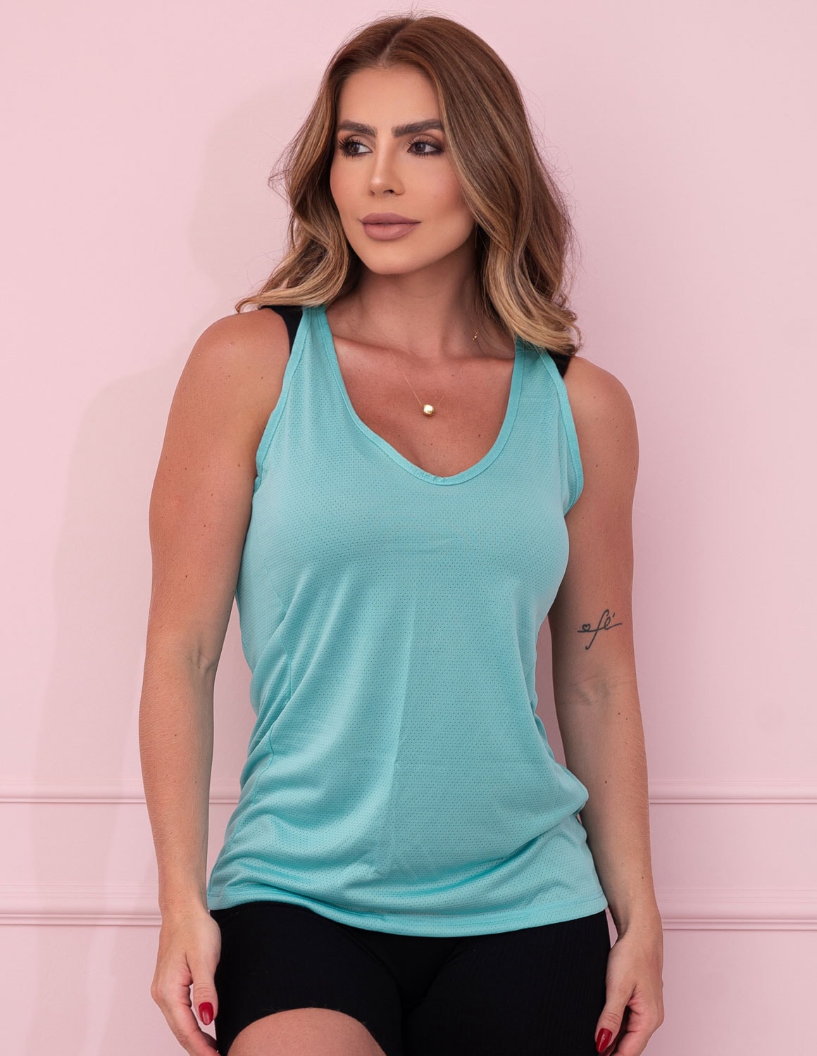 regata fitness fabricada em dry fit de poliéster. o modelo não possui mangas e conta com um charmoso decote em v.