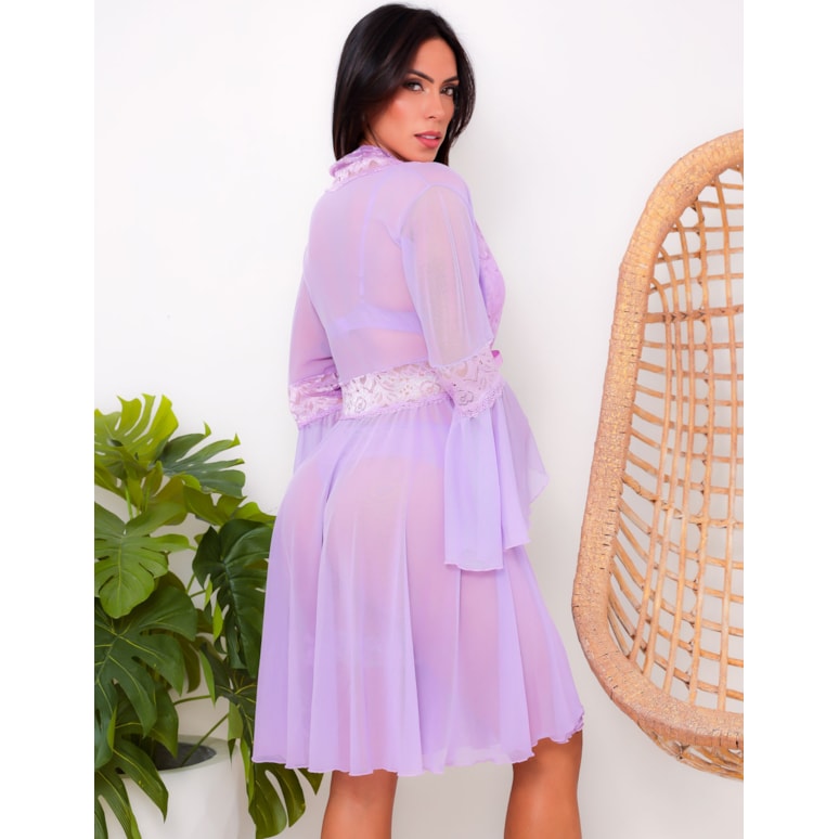 Robe Feminino com Manga Flare em Tule e Detalhes em Renda.