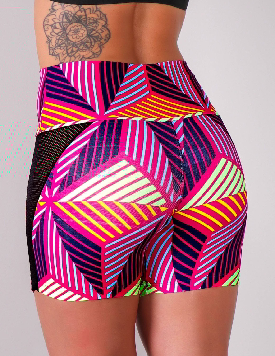 shortinho estampado em suplex de poliéster com recortes laterais de tela preta