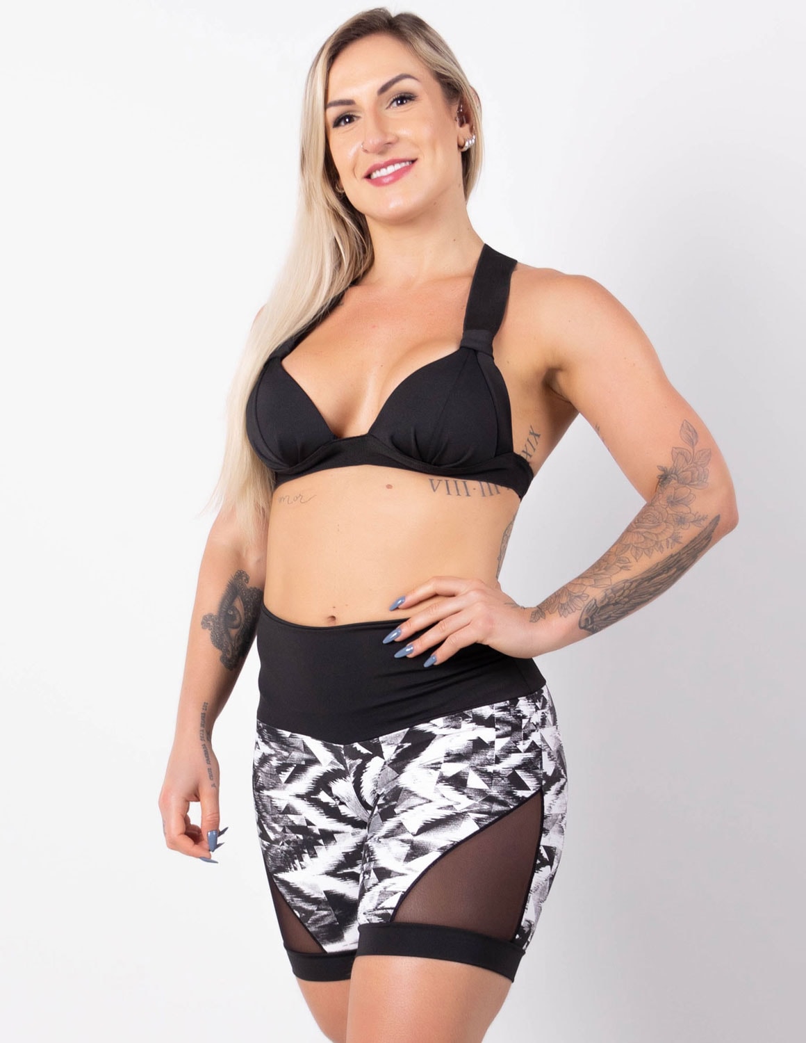short feminino confeccionado em suplex de poliéster estampado de alta qualidade, com tela prita em suas laterais.
