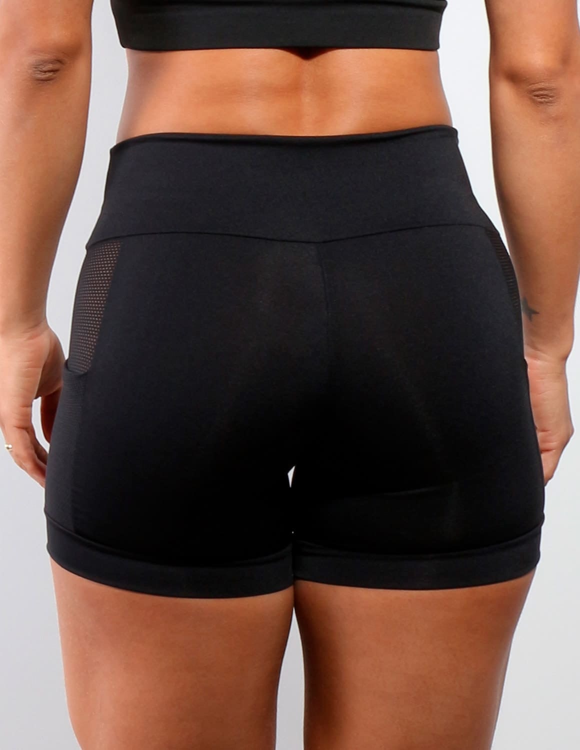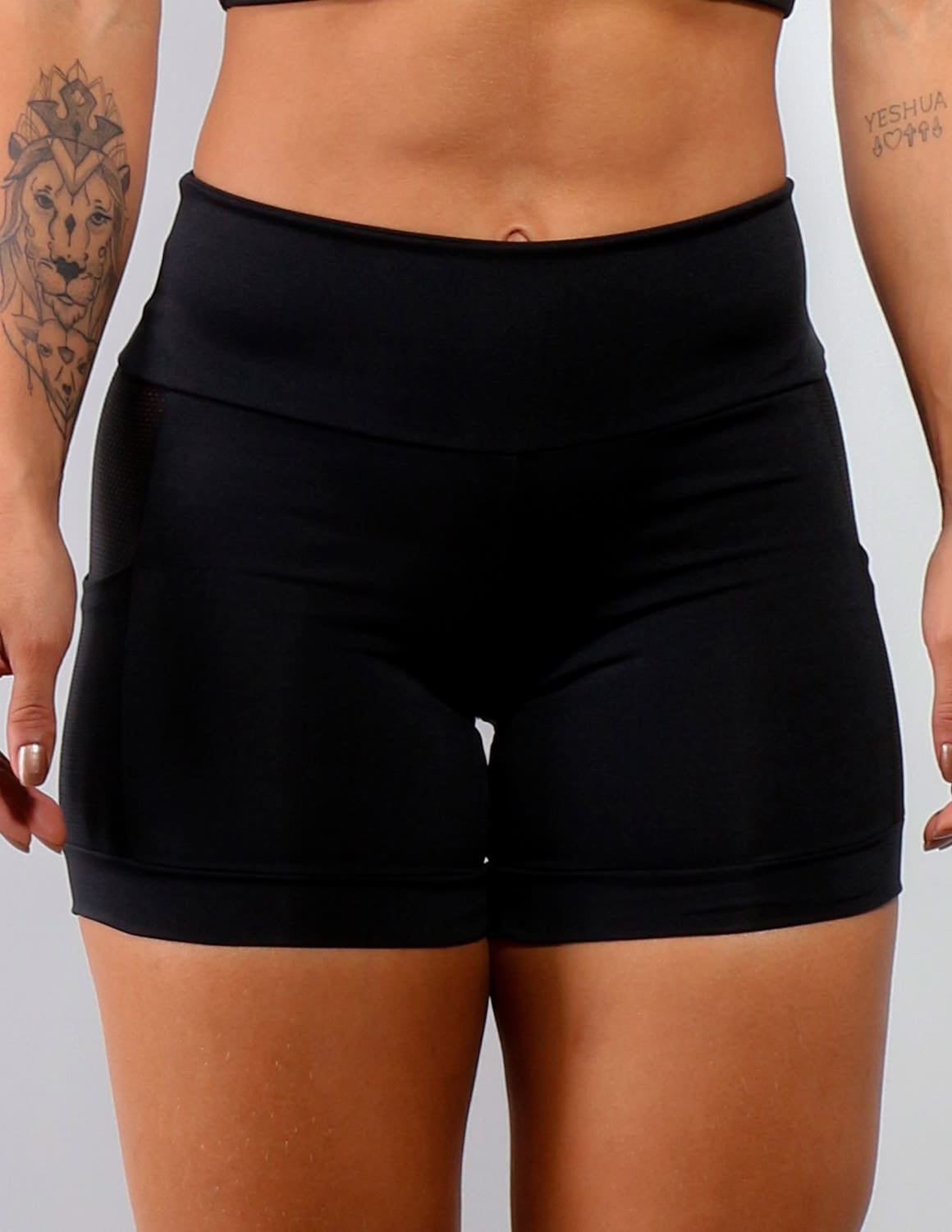 short feminino fitness confeccionado em suplex de poliéster de alta qualidade na cor preta.