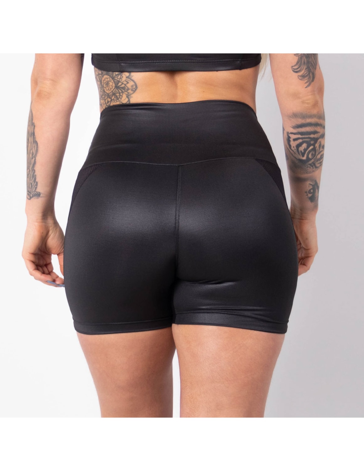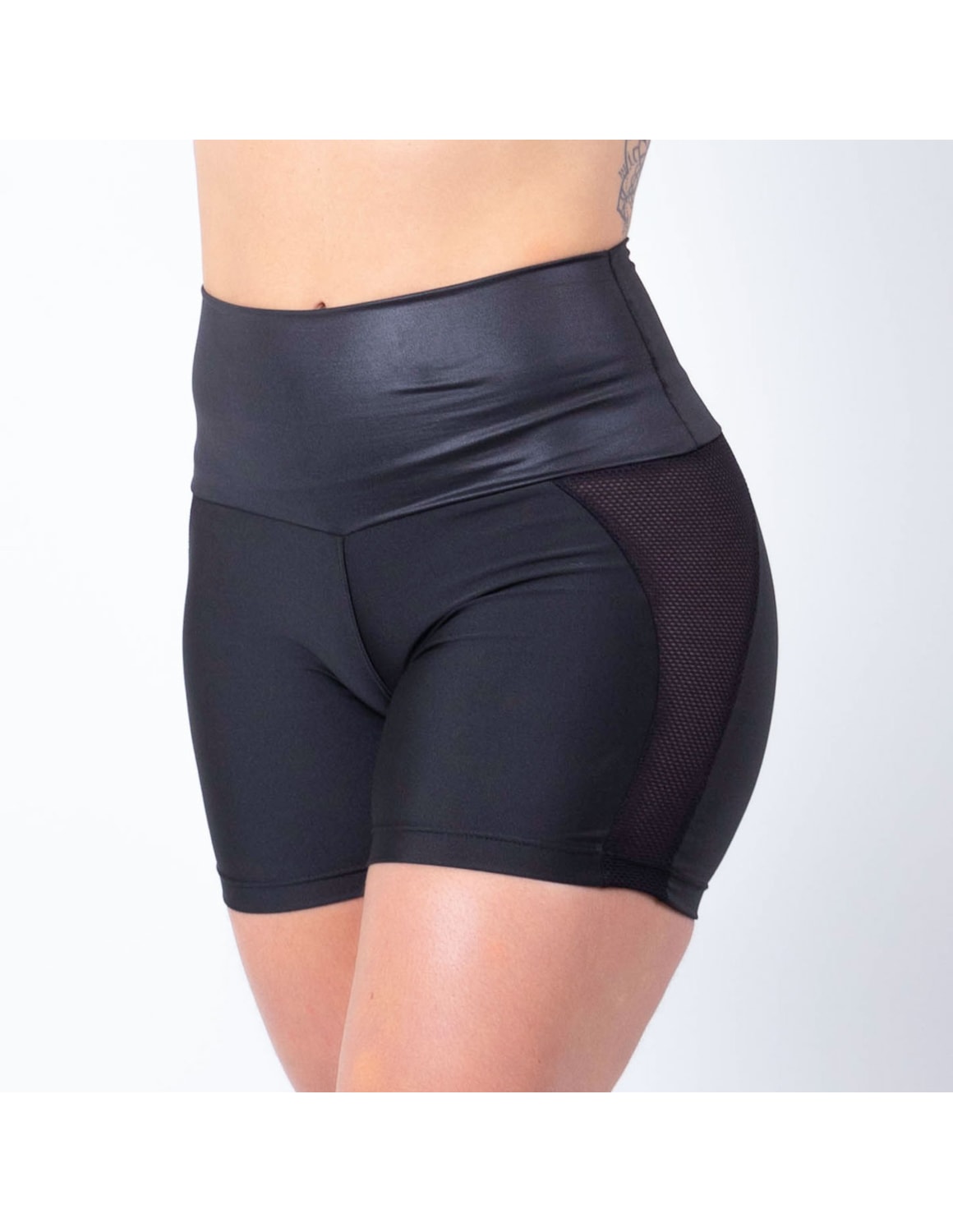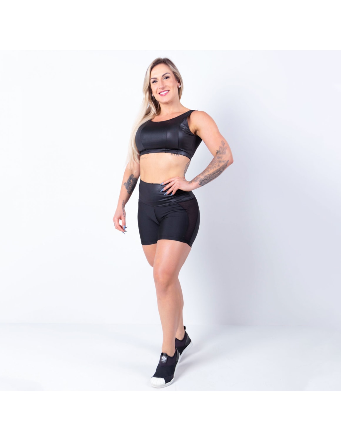 short preto fitness fabricado em suplex de poliéster com recortes laterais em tela, cós e parte de trás em cirrê.