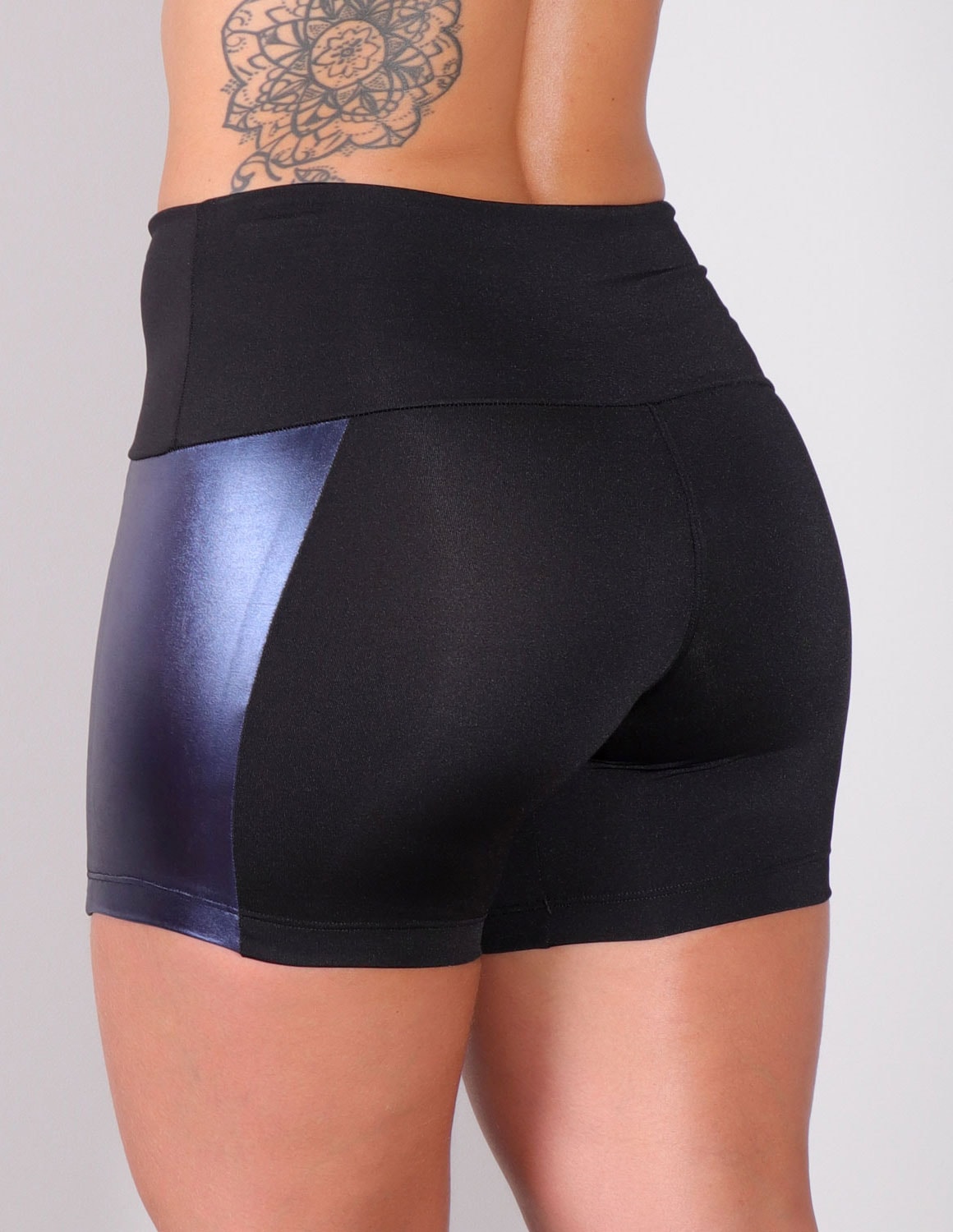 short feminino fitness preto confeccionado em suplex de poliéster com recortes azuis com brilho