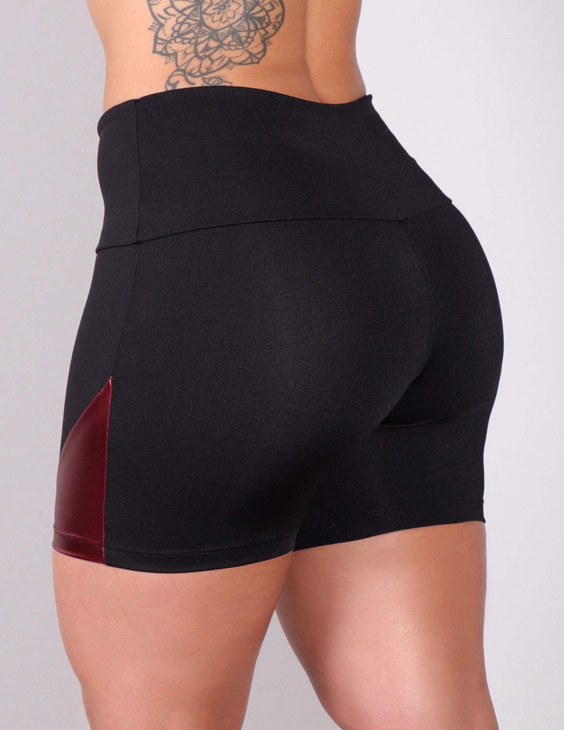 short fitness feminino preto confeccionado em suplex de poliéster com recortes vermelhos com brilho nas laterais