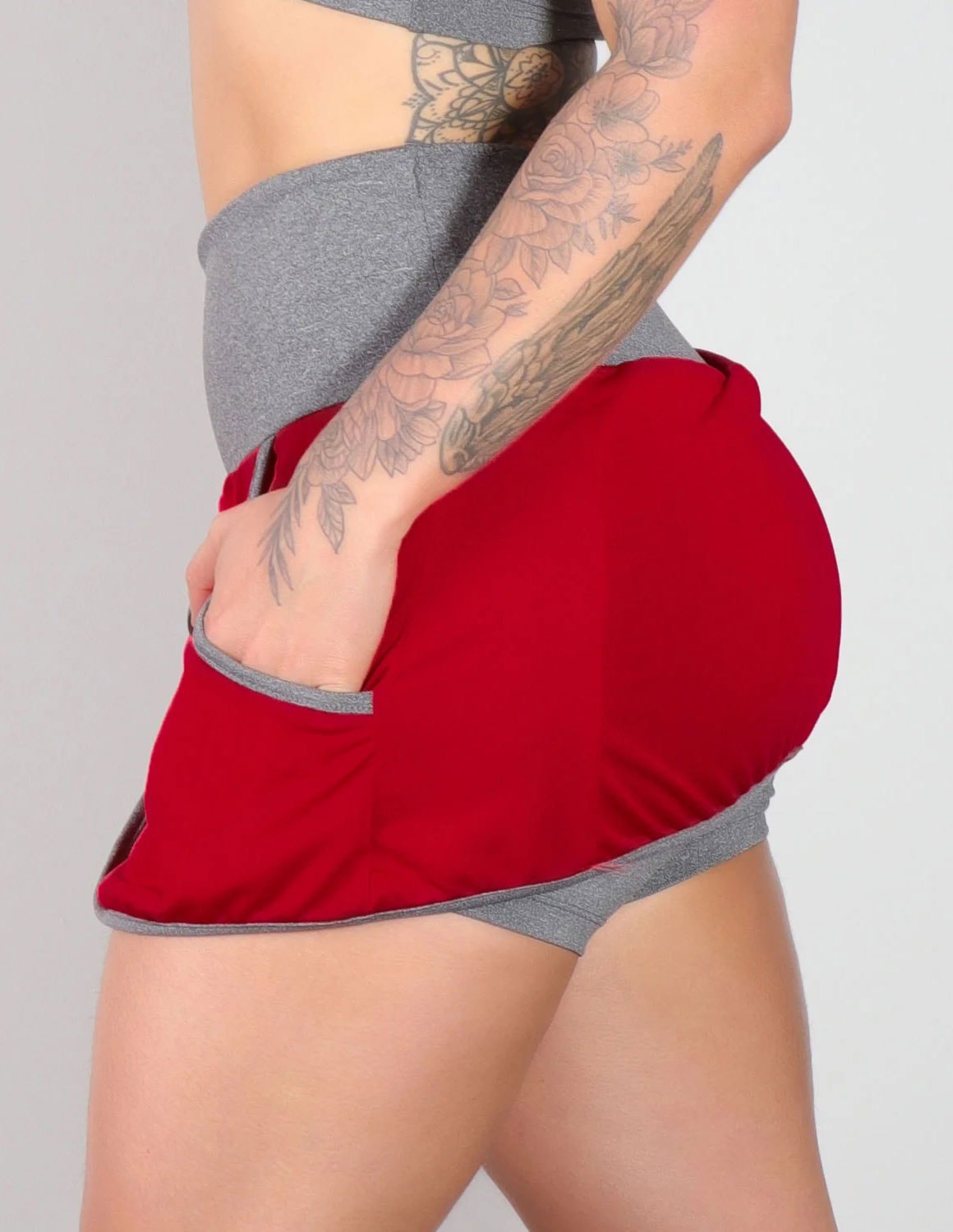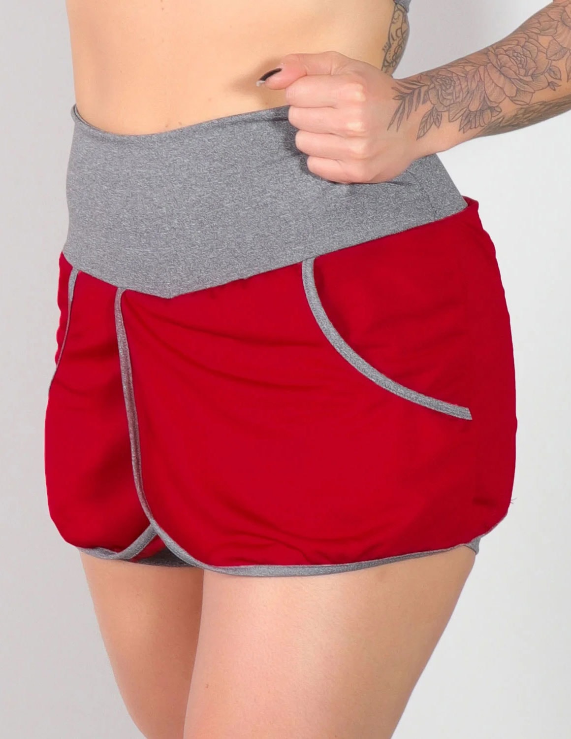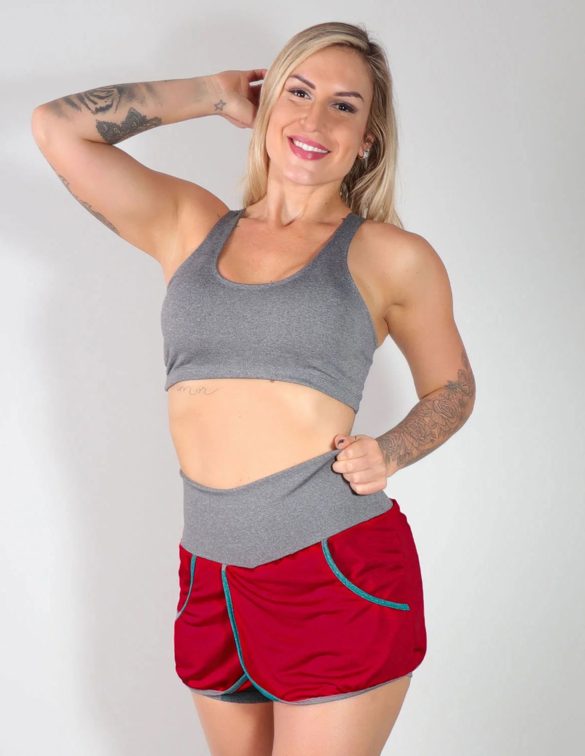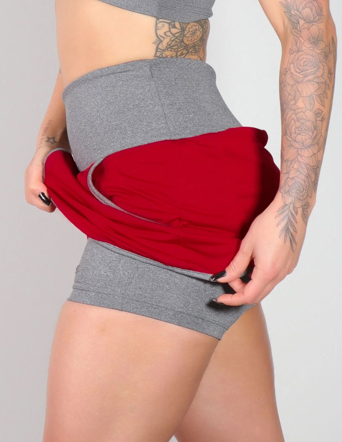 short saia fitness feminino com saia transpassada com bolsos em dry fit vinho, shortinho e cós de suplex mescla