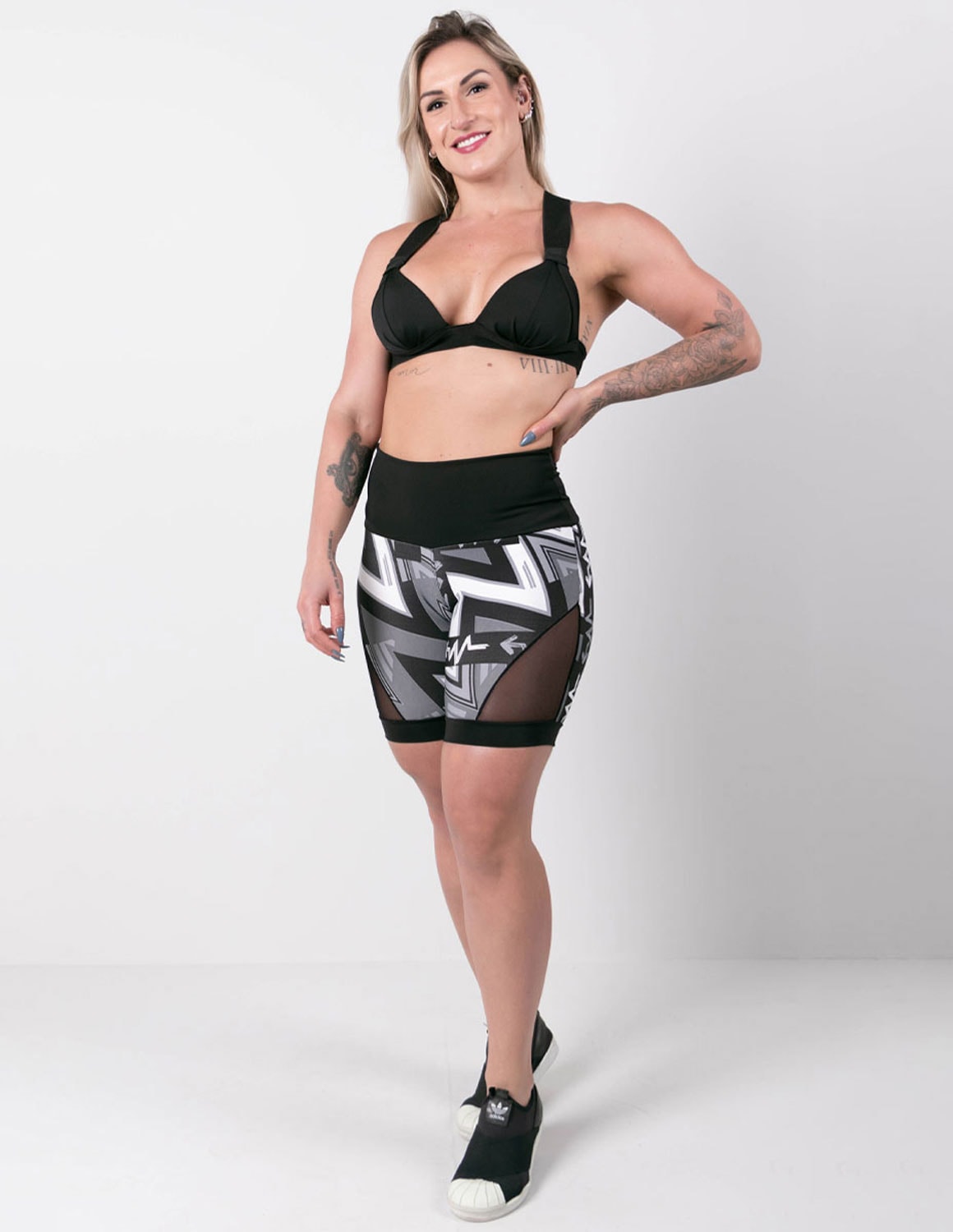 short feminino para academia confeccionado em suplex de poliéster estampado com recortes nas laterais de tule preto de poliamida.