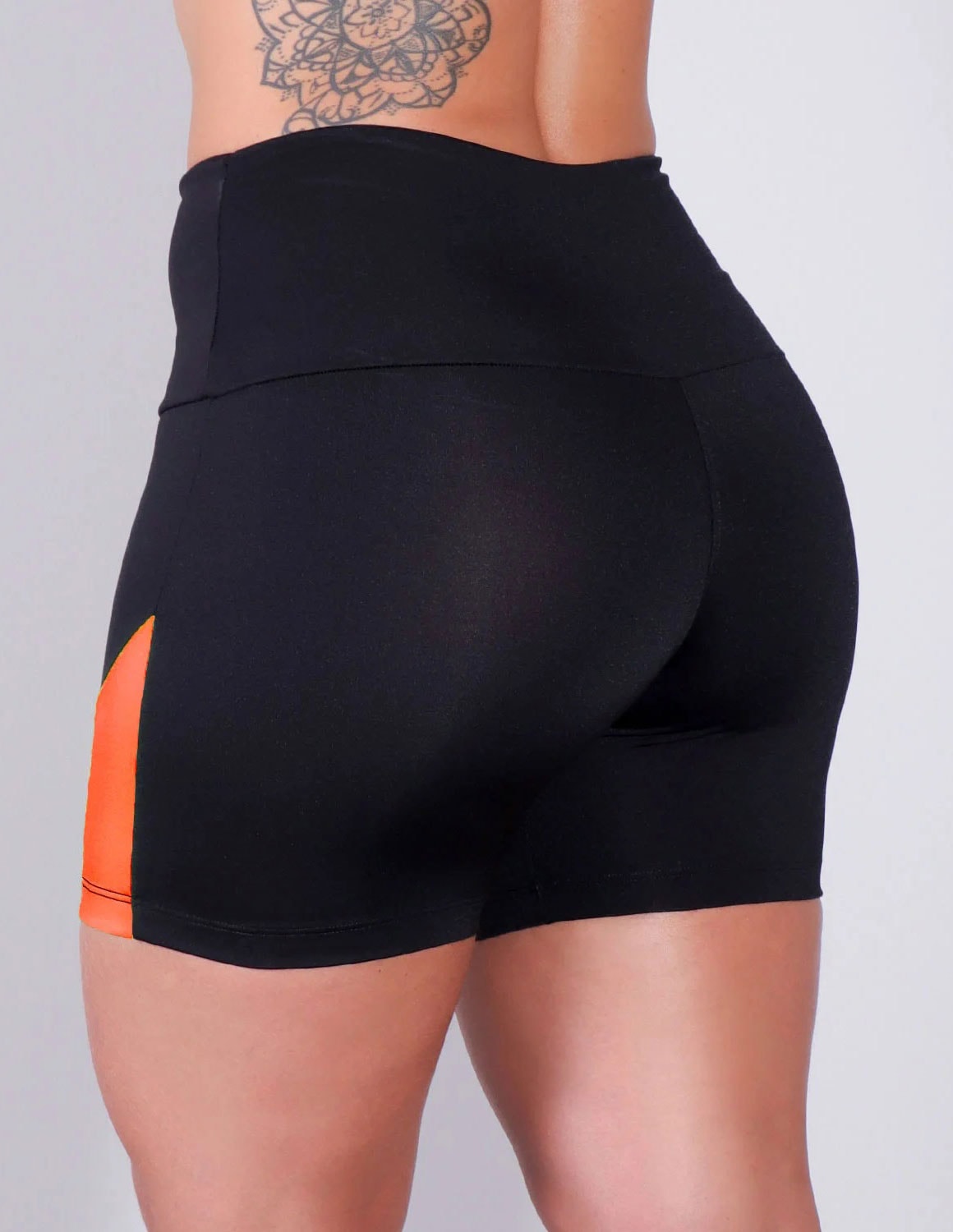 short fitness feminino confeccionado em suplex de poliéster preto com recortes laranja neon nas laterais