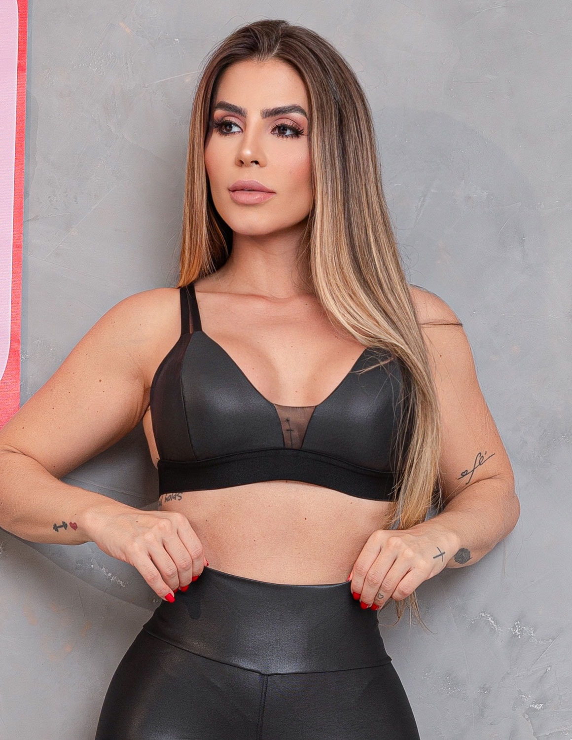 top fabricado em cirrê, o modelo possui recorte em tule no decote, o bojo removível e sua base de elástico com alças reguláveis, dando maior segurança na hora de seus movimentos.