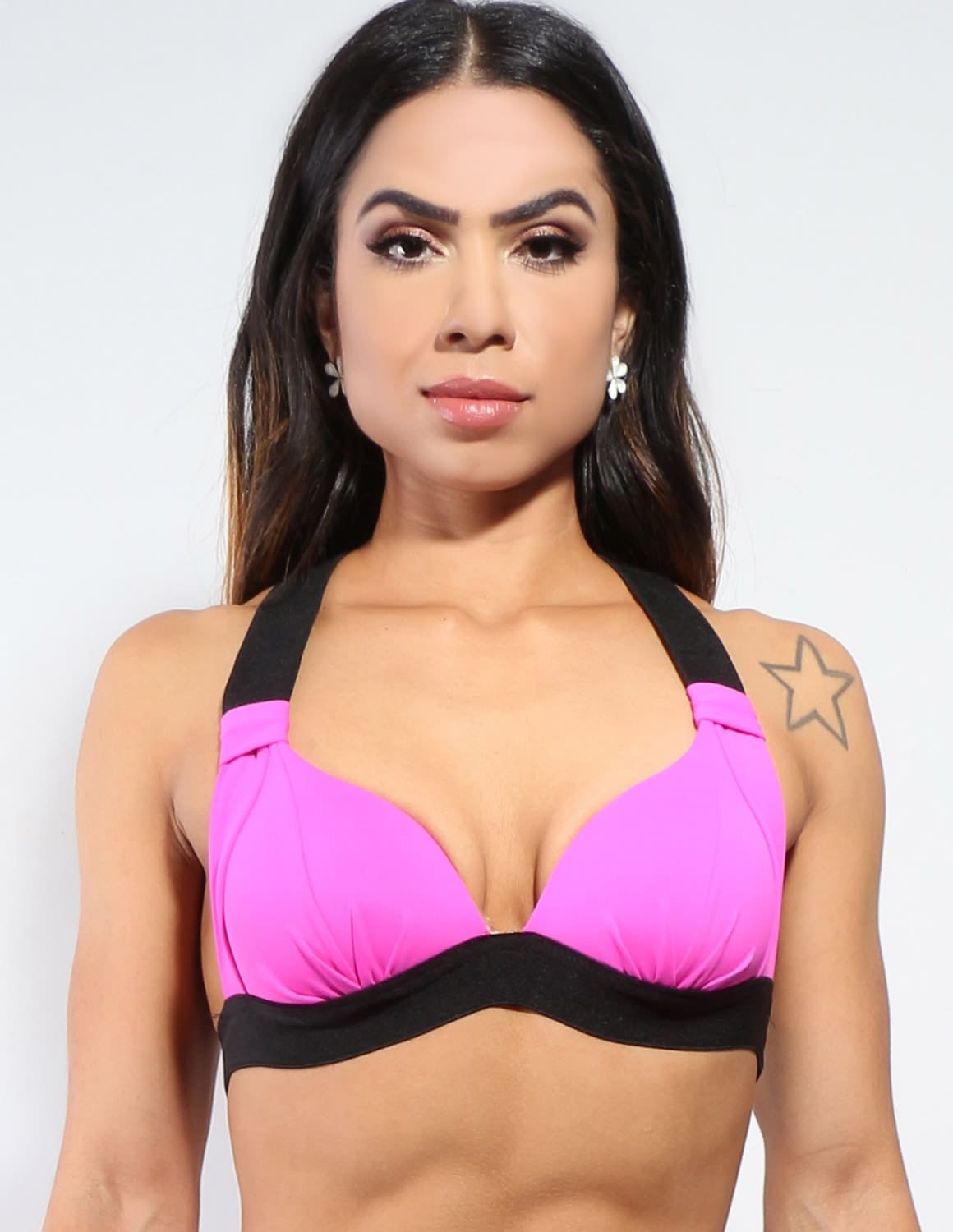 o top possui bojo e alças largas de elástico preto que ajudam na sustentação e acomodação dos seios.